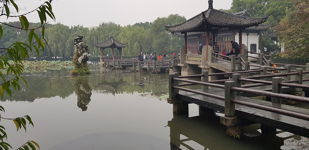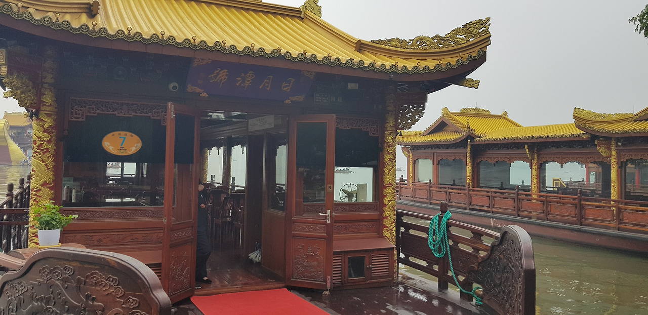 용처럼 생긴 황금색의 배다. 배는 호수 가운데를 이리저리 다니다, 어느 섬에 우리를 내려준다. 그 섬은 가운데가 호수로서, 마치 도넛 같은 모습을 하고 있다. 섬 가운데 호수를 이리저리 가로질러 아름다운 돌다리가 놓여 있으며, 그 연결점에는 풍경과 잘 어울리는 정자나 건물이 세워져 있다. 서호를 절경이라 한다면, 이 섬은 그야말로 절경 중의 절경이다. 섬 둘레를 걷고, 또 섬 가운데에 놓여 진 다리를 건너다보면, 어느 각도에서 보더라도 또 새로운 경치가 펼쳐진다.