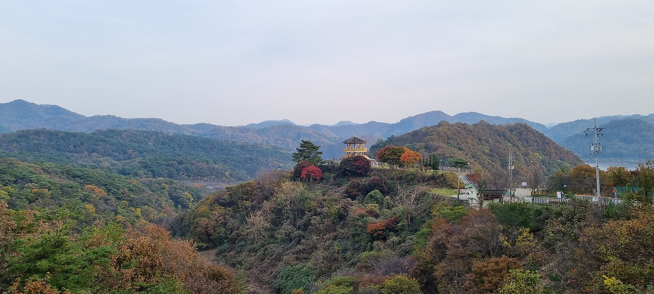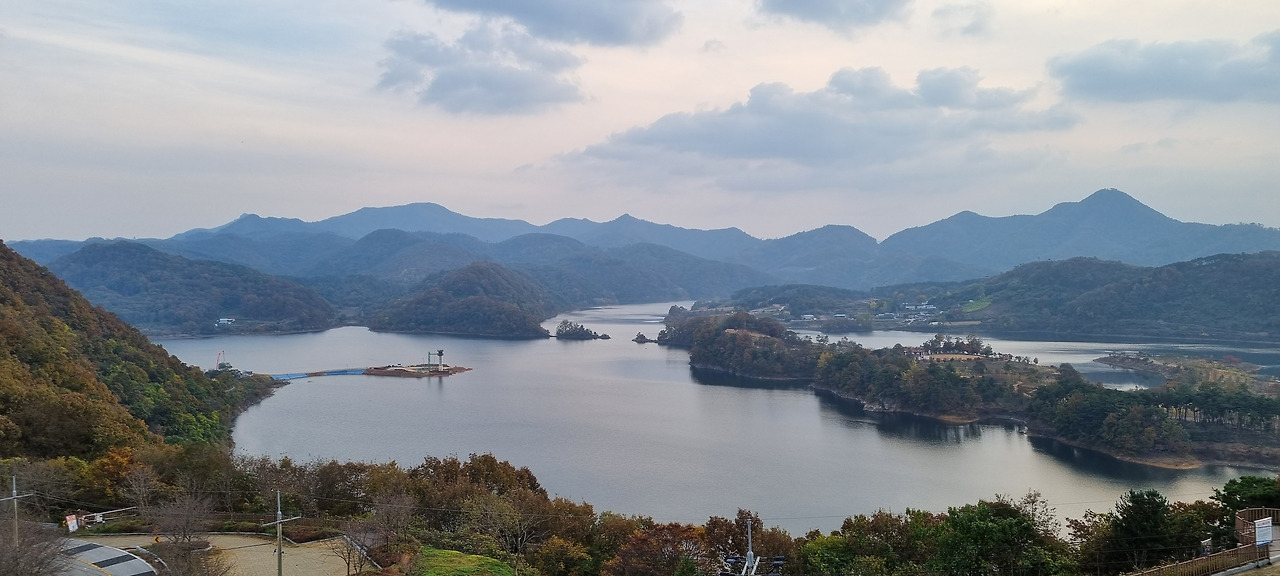 평일에다가 이미 늦은 시간이다 보니 관광객은 우리밖에 없다. 국사봉 전망대는 작은 정자 모습을 한 3층으로 된 건물이다. 이미 높은 곳에 위치해 있어 1층에서 보나 3층에서 보나 큰 차이는 없지만, 그래도 3층으로 올라갔다. 바로 아래에 붕어섬이 보인다. 여기서 보면 세로로 비스듬하게 길쭉하게 생긴 섬인데, 내 눈에는 붕어처럼 보이지는 않는다.