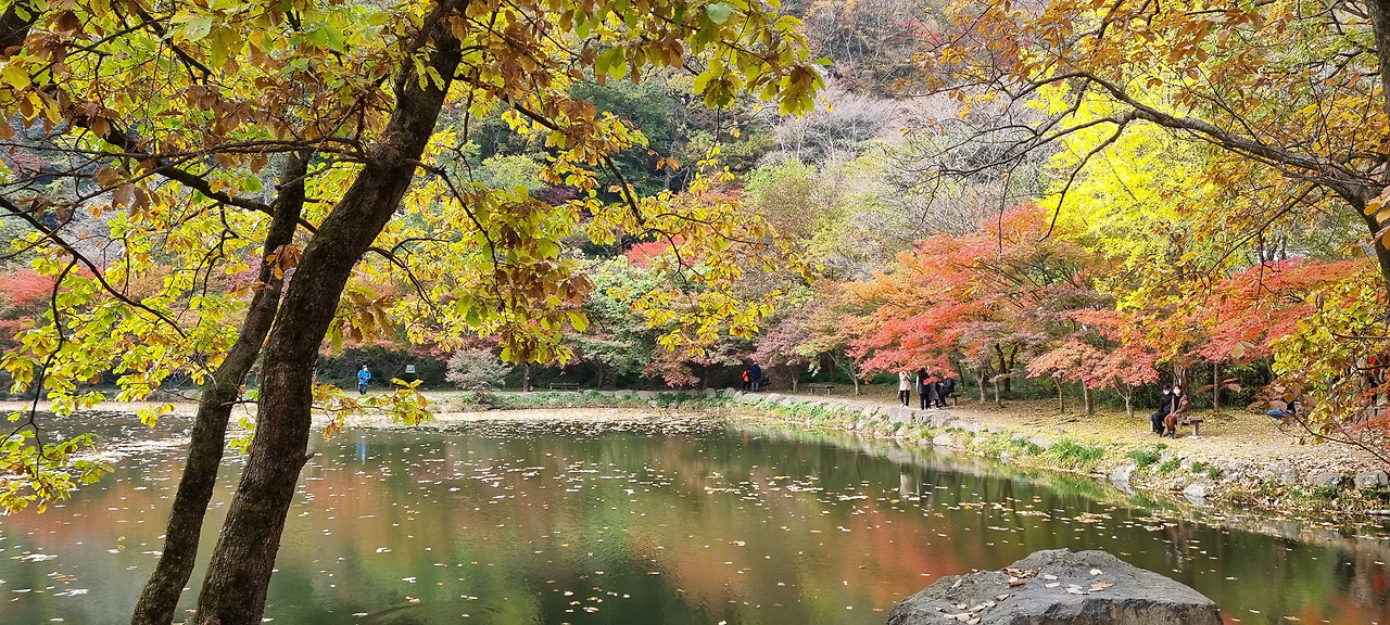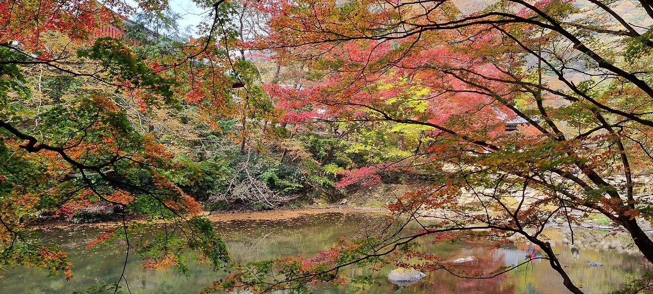 지금까지의 단풍길도 좋았지만, 정말 본격적인 단풍길은 지금부터이다. 계곡물을 막아 만든 넓은 웅덩이라 할까 호수가 있고 그 주위로는 붉고 노란 단풍이 화려하다. 단풍을 즐기려 온 관광객들은 핸드폰을 꺼내 셔터를 누르기 바쁘다. 정말 아름다운 풍경이다. 물을 가둔 웅덩이는 돌로 만든 둑으로 층층이 만들어져 있다. 여러 개의 작은 호수가 겹쳐 있는 느낌이다. 그리고 마지막 웅덩이 저 쪽에는 누각이 서 있어 경관을 더욱 아름답게 한다.