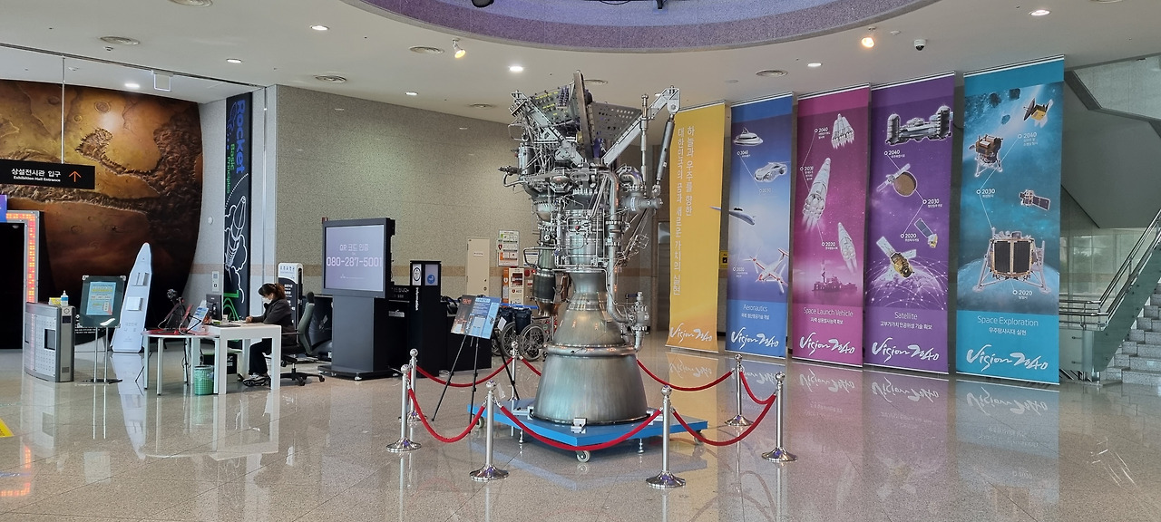 나로우주센터의 우주과학관에 도착하였다. 3채의 건물로 이루어진 나로우주센터 과학관이 있고, 그 앞의 넓은 광장에는 로켓 조형물이 우뚝 서있다. 광장 앞은 남해바다이다. 광장에 서있는 로켓 조형물은 어떤 로켓을 모델로 하고 있는지는 모르겠지만 생각보다는 상당히 컸다. 높이가 거의 20미터 정도 되지 않을까 생각된다. 우주과학관과 그 앞의 광장은 우주센터를 방문하는 관광객들을 위한 공간인 것 같다. 우주센터 직원들이 연구를 하는 건물은 아마 더 깊은 곳에 자리잡고 있지 않을까 생각한다. 엄격한 보안과 통제를 필요로 하는 시설이라 일반인이 쉽게 접근할 수 없는 곳에 위치하고 있을 것으로 생각된다.