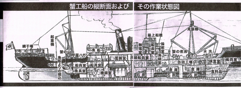 이때 일본의 중요한 수출 품목이 게 통조림이었다. 오츠크 해에서 잡은 게를 통조림으로 가공하여 미국과 유럽 등에 수출하였는데, 이것이 큰 인기가 있어 일본의 외화 획득에 중요한 기반의 되었다. 이러한 이유로 게 어로와 가공은 당시 일본의 국책 사업이 되어, 정부의 적극적인 지원이 이루어졌다. 게 어로작업은 게를 잡는 어선과 잡은 게를 바로 통조림으로 가공하는 제조선으로 구성된다. 이 게 통조림을 제조하는 배가 바로 카니코센(蟹工船, 해공선)이다. 이러한 게 어로는 게 통조림을 제조하는 한 척의 카니코센이 여러 척의 게 어선을 거느리는 선단 형식으로 구성되었다.