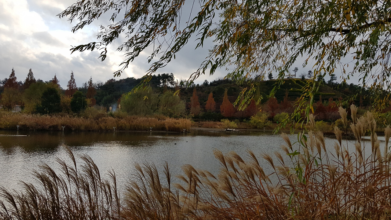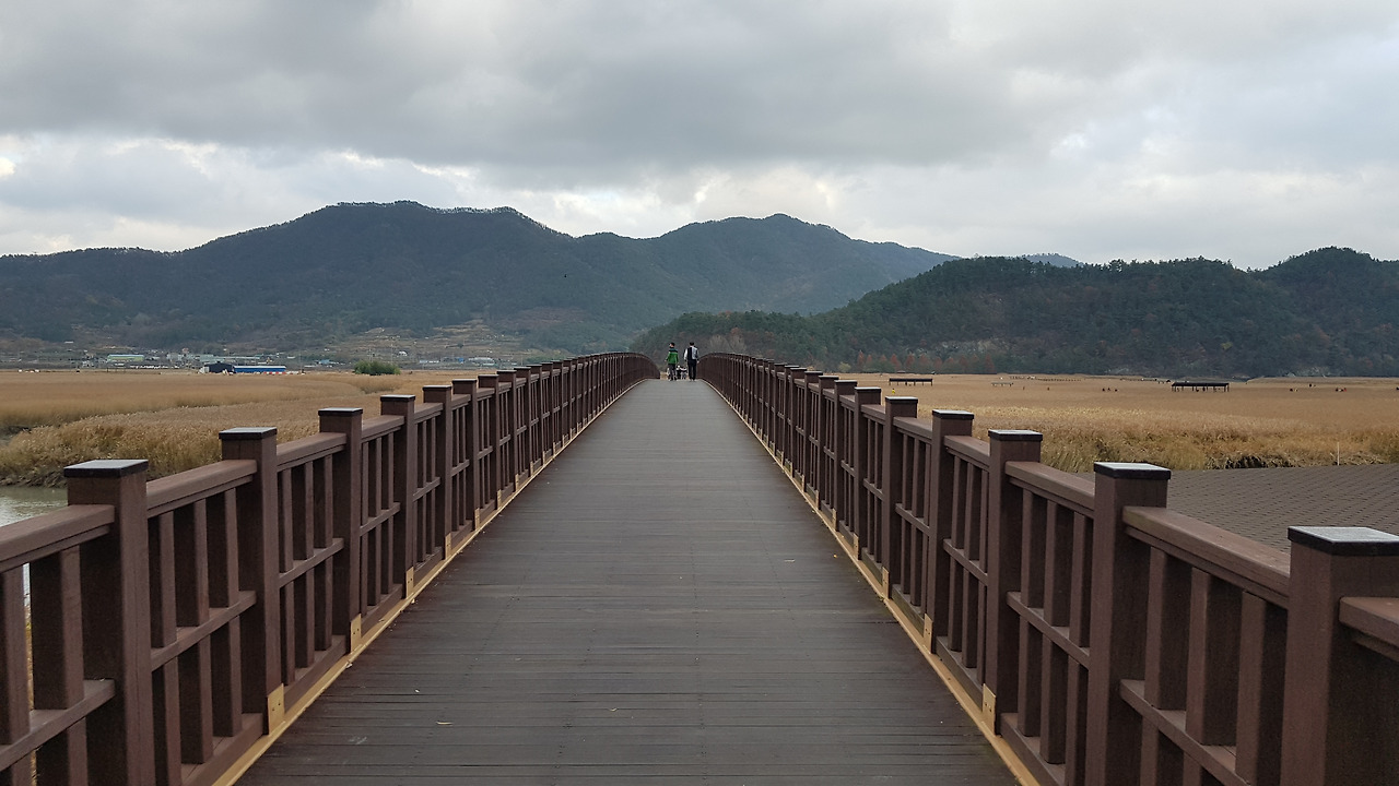 끝없는 개펄에 누런 황금색 갈대숲이 펼쳐져 있다. 오늘 같이 흐린 늦가을 나리 순천만 습지를 즐기기에는 제일 좋은 것 같다. 갈대밭 사이로 나무로 만든 테크 산책길이 놓여 있어 산책하기에는 그만이다. 길 중간중간에는 쉼터도 있고, 쉼터에는 벤치도 놓여 있어 아픈 다리를 쉴 수도 있다. 다만 한 가지 아쉬운 점은 데크 산책길이 조금 높다는 느낌이다. 그래서 갈대 끝이 발목을 조금 넘는 정도이다. 그러다 보니 갈대숲을 내려다보며 걷게 된다. 산책길이 조금 낮아 갈대숲 속으로 걷게 하였으면 더 좋았을 걸 하는 생각이 든다. 그렇지만 그렇게 할 경우 내가 생각 못한 다른 문제가 생길지도 모르겠다. 이곳 순천만 습지는 언제라도 다시 오고 싶은 곳이다.