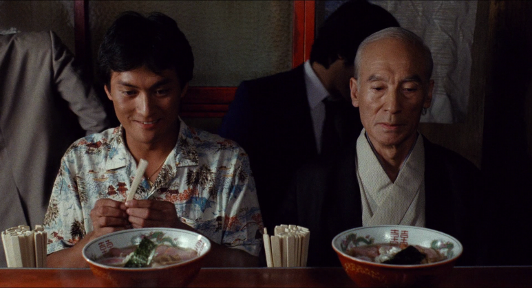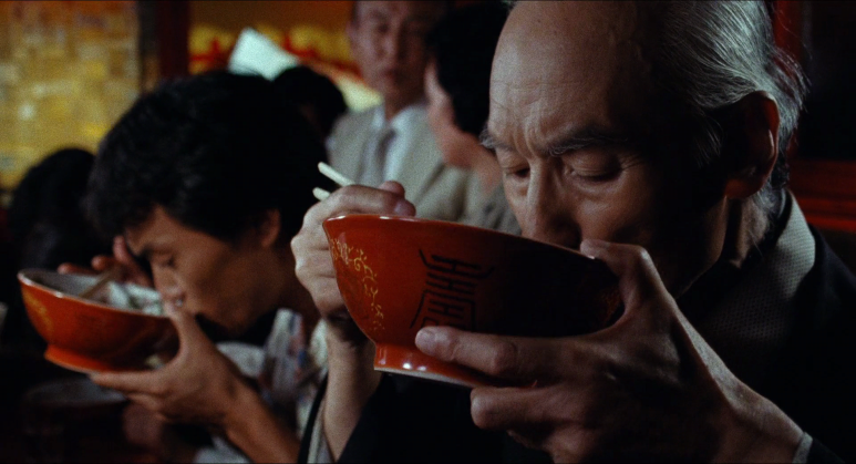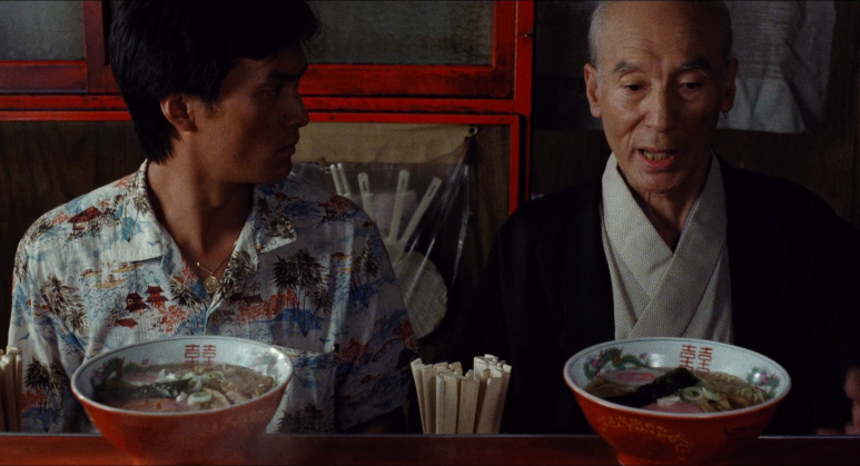 이 영화에서 라면의 도(道)를 추구하는 노인은 등장은 재미있다. 그는 찾아온 젊은이와 라면집을 찾아가서 라면을 먹는 법을 가르쳐준다. 먼저 라면이 나오면 눈을 지그시 감고 라면과 마음의 교감을 한다. 그리고는 라면 그릇에 코를 가까이해서 라면의 냄새를 맡는다. 라면을 정신을 몸속으로 흡수하는 과정이다. 그리고는 나무젓가락으로 쨔슈(일본 라면에서 라면 위에 얹는 얇은 삶은 돼지고기)를 가볍게 두어 번 쓰다듬는다. 그리고는 라면을 한 젓가락 먹고 그 맛을 깊이 음미한다. 이렇게 라면을 다 먹고 나면 국물을 마신다. 라면 국물을 마실 때도 법도가 있다. 자세를 꼿꼿이 하여 국물을 한 모금 먹고 그릇을 내려놓는다. 그리고 이런 행동을 반복하여 라면 식사를 마친다.