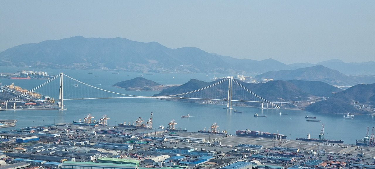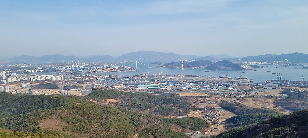 전망대에 오르면 광양만이 한눈에 들어온다. 저 멀리 바다 건너 하동, 순천, 여수, 남해가 보이며 광양만에 접한 이쪽에는 광양제철을 비롯하여 세풍산단, 익산산단, 율촌산단 등 산업단지들이 위치하고 있다. 왼쪽으로는 조금 전에 건너왔던 이순신 대교가 보인다. 이순신 대교는 가까이서 볼 때도 멋있지만, 이렇게 멀리서 바라보면 또 다른 흥취가 있다. 전망대 한쪽에는 망원경이 놓여있다. 이전에는 이런 곳에 있는 망원경은 모두 500원짜리 동전을 넣어야 볼 수 있지만, 요즘은 돈을 받는 곳이 거의 없다. 망원경으로 이순신 대교를 보니 손 앞에 잡힐 듯이 가까이 보인다.