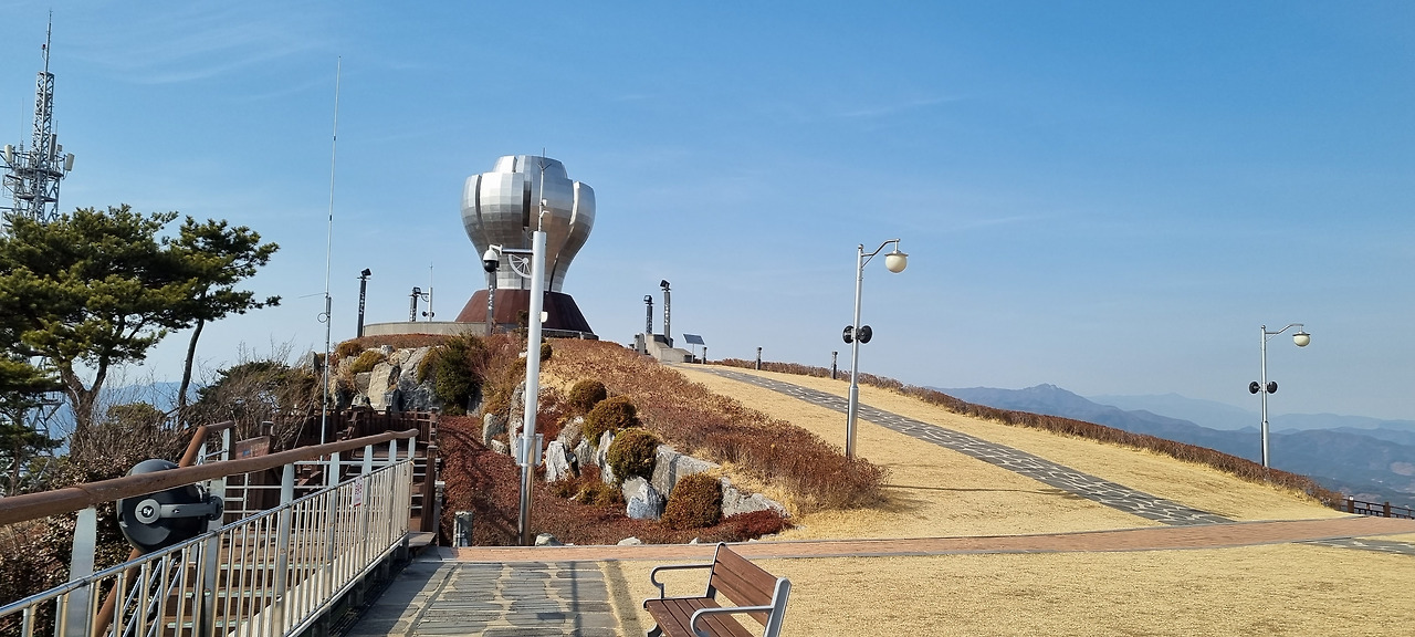 전망대 바로 아래 주차장이 있어 차로 쉽게 접근할 수 있었다. 그런데, 주차장에서 전망대까지 거리는 200미터도 채 되지 않았지만 그 가파르기가 보통 아니다. 계단이 설치되어 있지만 경사가 심하여 오르기가 힘들다. 집사람은 따라 올라오다가 중간에 포기하고 만다. 전망대 위에 오르니 광장처럼 생긴 넓은 전망대가 있고, 그 위쪽으로는 금속으로 만든 봉수대가 설치되어 있다.