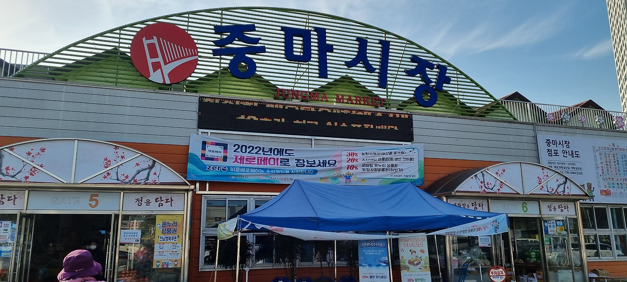 중마시장에 도착하여 먼저 주차장을 보고 깜짝 놀랐다. 시장 바로 앞에 주차장이 있는데, 마치 대형마트의 주차장처럼 공간도 넉넉했고 편리했다. 이런 주차장이 설치되어 있으면 구태여 대형마트에 갈 필요가 없다는 생각이 들만큼 주차가 편리했다.