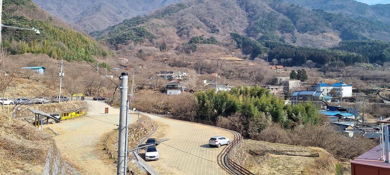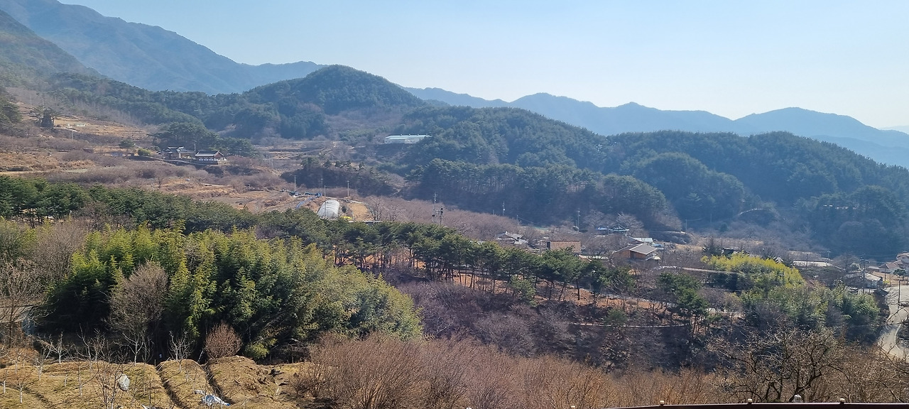 산수유 마을은 완만한 넓은 계곡에 자리 잡고 있다. 집집마다 산수유나무가 있고, 길 가나 밭, 그리고 마을 구석구석에 산수유나무들이 자라고 있지만 꽃이 필 낌새도 보이지 않는다. 마을 뒤를 지나는 높은 도로 옆에 있는 전망대에서 마을 구경만 하고 돌아 설 수밖에 없었다. 역시 3월 말이나 되어 여행을 할 걸 그랬나 하는 생각이 들었다.