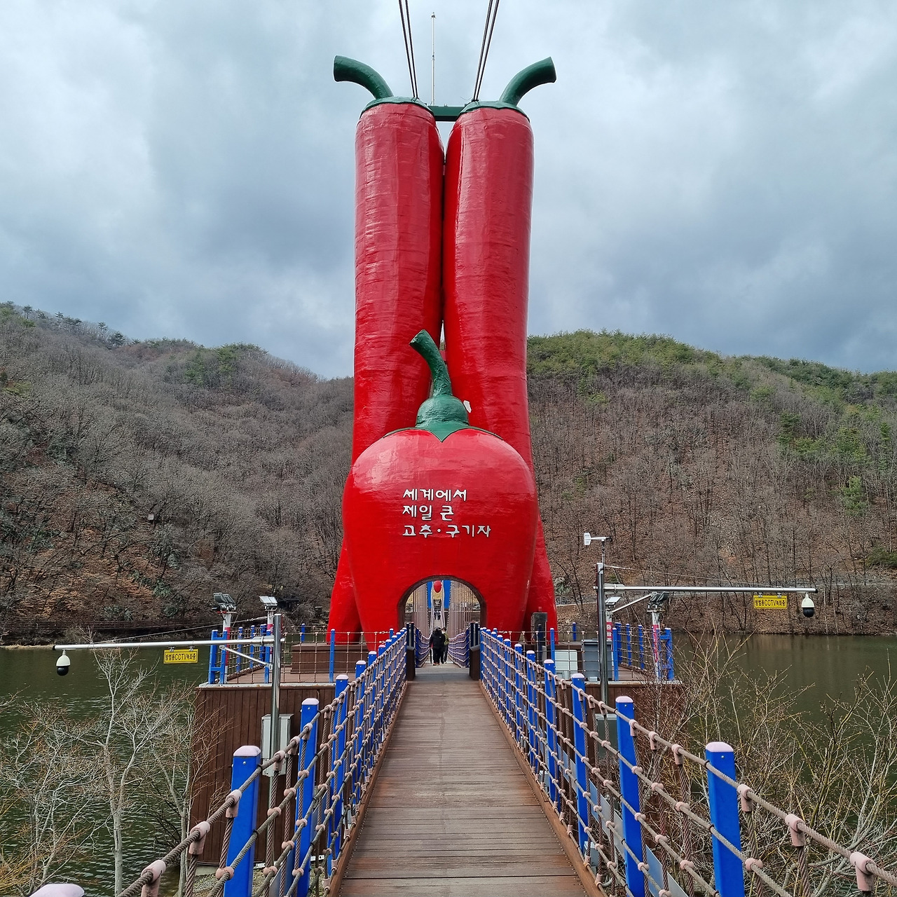 출렁다리 위를 걸어서 호수 저쪽으로 건너간다. 천장호 출렁다리 가운데에는 청양고추를 형상화한 탑이 있다. 다리를 걷다 보면 이름 그대로 다리가 조금씩 흔들리는 것을 느낄 수 있다. 다리 위에서 보면 호수 둘레로 나무로 만든 산책로가 만들어져 있다. 우리나라는 요즘 조금 알려진 곳을 찾아가 보면 어디에나 걷기 좋은 산책로를 만들어 두고 있다. 이 산책로만 찾아다녀도 건강은 걱정할 필요가 없다는 생각이 든다. 호수와 출렁다리의 경치가 아주 잘 어울린다. 아주 아름다운 다리이다.