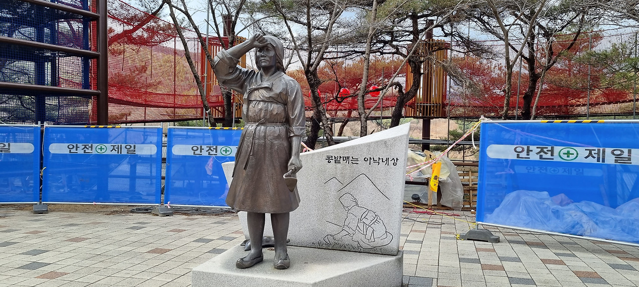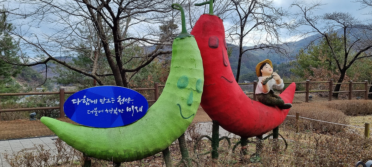 주차장에 차를 주차한 후 출렁다리 쪽으로 내려간다. 조금 내려가다 보니 청양고추를 형상화한 작은 구조물이 보이고 곧이어 “콩밭 매는 아낙네”의 등신상이 보인다. 조금 더 내려가면 출렁다리가 나오는데, 이 출렁다리는 길이가 200미터 조금 넘는다. 우리나라에서 제일 긴 출렁다리라고 하는데, 그것은 아마 이 출렁다리를 건설할 무렵에 그랬던 것이 아닐까 생각한다. 요즘은 우리나라 전국 방방곡곡에 출렁다리가 놓여져 있다. 출렁다리를 건설하는 것이 마치 유행처럼 느껴지는데, 그러다 보니 최근 크고 아름다운 출렁다리가 많이 만들어져 더 이상 천장호 출렁다리가 우리나라에서 제일 길다고 주장하기는 어려울 것 같다.