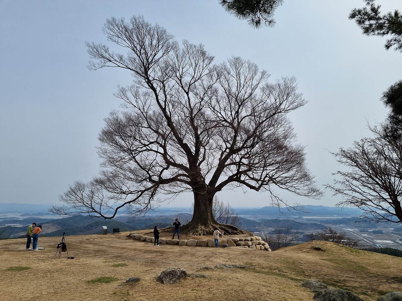 사랑나무는 아주 큰 느티나무이다. 가지가 균형 있게 활짝 펴져 나무 전체의 모습이 마치 하트 모양을 하고 있다고 해서 그런 이름이 붙었다고 한다. 이곳에 오르면 저 멀리 산아래 풍경이 그림처럼 펼쳐진다. 정말 볼만한 경치이다. 사랑나무는 크기도 하려니와 아주 잘생겼다. 사진을 찍으려고 하는데 연인인 듯한 젊은 남녀가 나무 앞에서 사진을 찍고 있다. 삼발이 카메라를 설치한 후 갖은 포즈로 사진을 찍고 있는데, 내가 사진을 찍으려 옆에 서있는데도 불구하고 좀처럼 자리를 비켜주지 않는다. 거의 10여분을 기다렸는데도 도무지 끝낼 기미가 보이지 않는다.