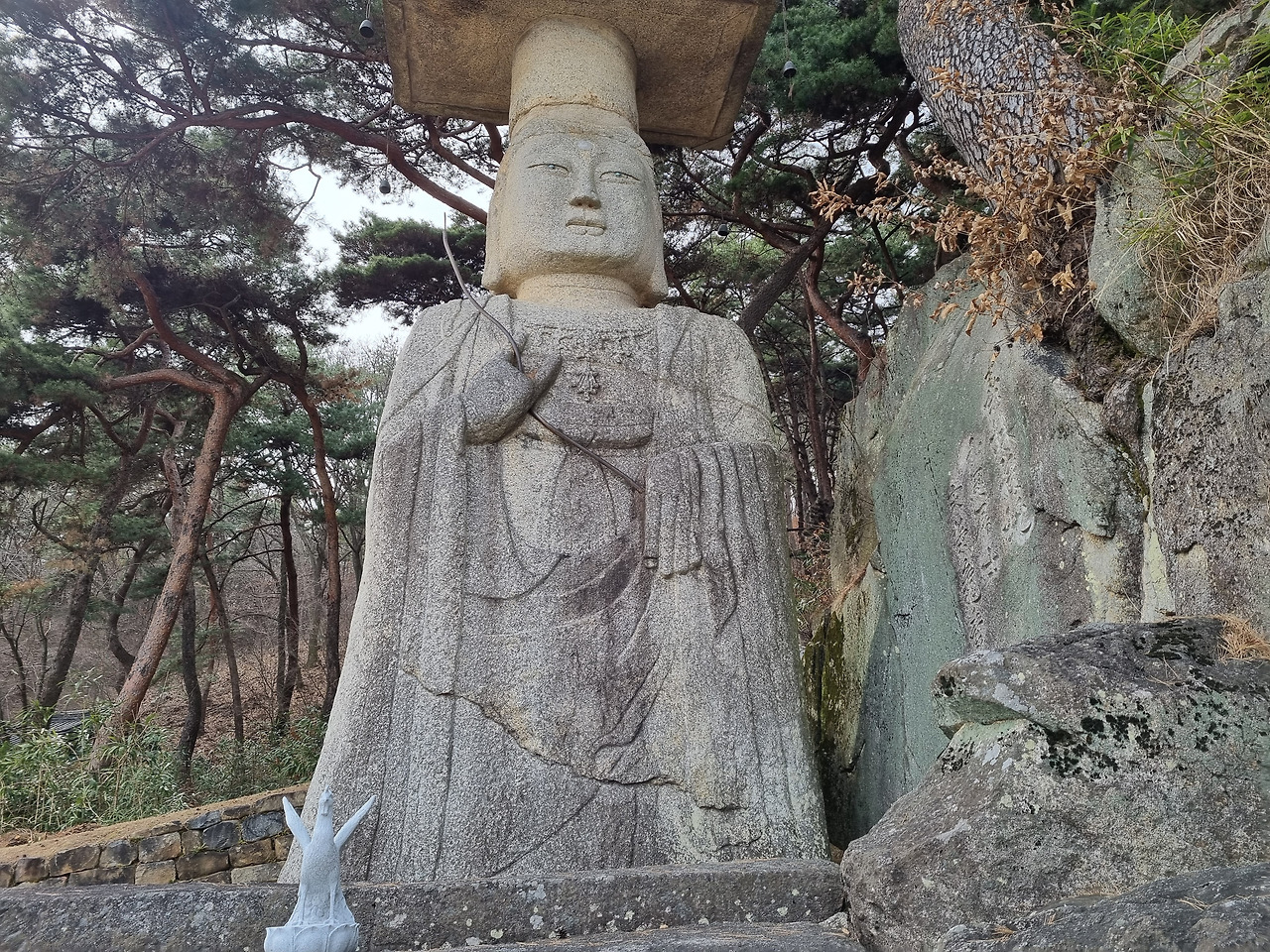 절 뒤쪽으로 돌아가니 대조사를 상징하는 석제 미륵보살입상이 서있다. 이 보살 입상은 보물 217호로 지정되어 있다. 논산에 있는 은진미륵과 마찬가지로 고려 초에 만든 것으로 추측된다고 한다. 높이가 10미터 정도 되어 상당히 큰 보살상이다. 보살상 옆은 바위 절벽인데, 보살상은 바위 절벽과 1미터 정도 떨어져 있다. 보살상을 만들기 위해 여기까지 이 큰 바위를 가져올 수는 없었을 것이고, 원래 이 자리에 있던 자연석에 보살상을 조각했을 것인데, 어떻게 이렇게 땅 속에서 솟아난 듯한 바위가 있었는지 신기한 느낌이 든다. 아니면 절벽을 잘라 보살상을 만들고, 보살상과 절벽 사이의 바위를 제거한 것인가 하는 생각도 든다.