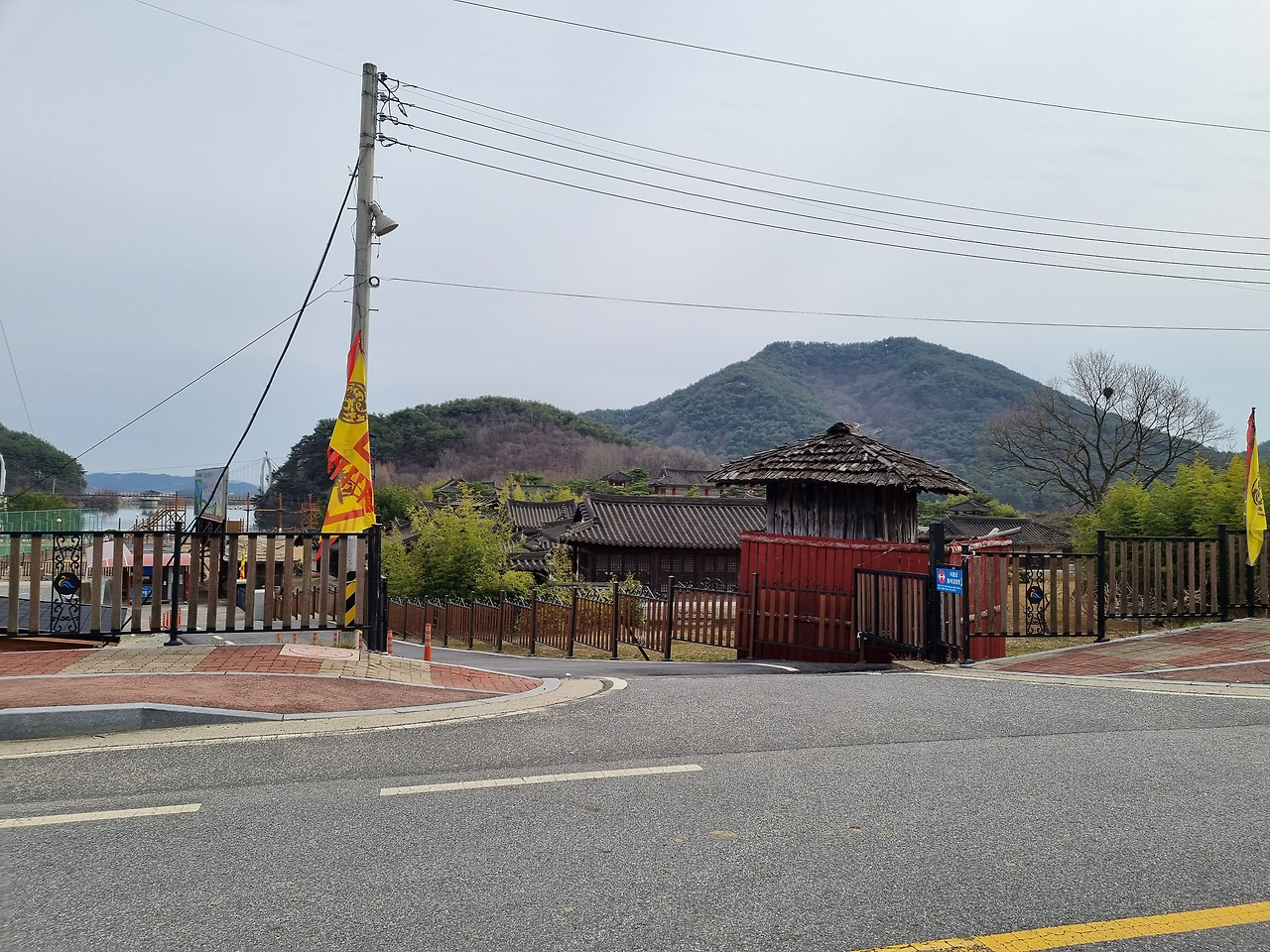 입구 가까이 갔는데도 관광객이 거의 보이지 않는다. 그제서야 오늘이 월요일이란 생각이 났다. 대개의 박물관이나 전시관, 문화시설 등은 대부분 월요일이 휴관일인데, 이곳도 마찬가지이다. 모처럼 여기까지 와서 그냥 돌아가기도 그렇고 해서 담장 너머로 안쪽을 들여다보았다. 상당히 짜임새 있게 만든 세트장인 것 같다. 그동안 문경새재 왕건 오픈세트장, 완도의 장보고 오픈세트장 등 여러 곳을 가본 적이 있는데, 밖에서 보기에는 이곳이 제일 짜임새가 있는 것 같다.
