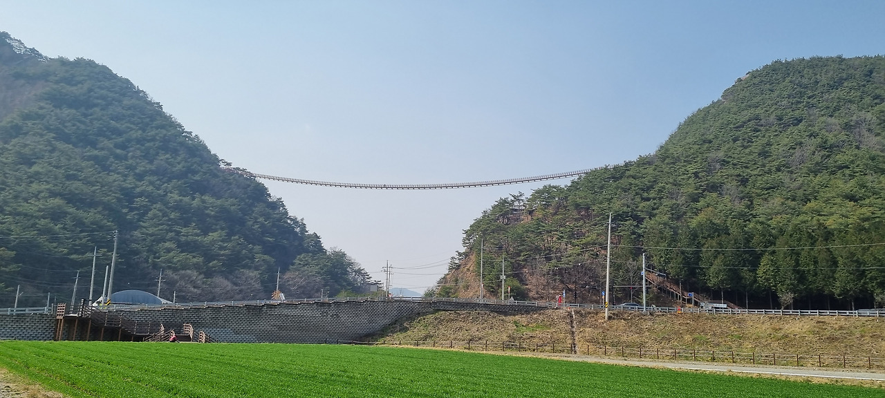 영월사를 나와 한참을 달려 채계산 출렁다리 주차장에 도착하였다. 아주 넓은 주차장이다. 그런데 차에서 내리니 어디로 가야 출렁다리가 나오는지 알 수가 없다. 출렁다리로 가는 길 안내판도 보이지 않는다. 사방을 둘러보았지만 출렁다리는 보이지 않는다. 마침 옆에 차를 세우고 내리는 사람에게 어디로 가야 출렁다리가 있는지 물어보았다. 그러자 “저기 있잖아요” 하고 가리키는데, 뒤를 돌아보니 저 멀리 도로 위로 두 봉우리 사이에 긴 다리가 걸려 있다. 좀 전에 사방을 다 둘러보았는데 왜 저렇게 금방 보이는 것을 못 찾았을까?