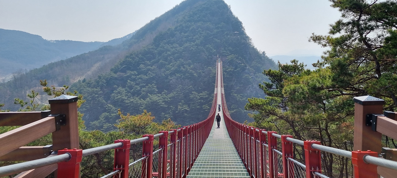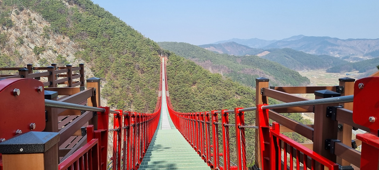 출렁다리로 올라가는 길은 꽤 가파르다. 그렇지만 나무로 만든 도보 계단으로 되어 있기 때문에 큰 힘은 들지 않는다. 15분 남짓 걸어 올라갔을까, 출렁다리가 나온다. 출렁다리는 이쪽 산에서 국도를 가로질러 저쪽 산으로 걸쳐 있다. 다리를 받치는 기둥이 없는 현수교이기 때문에 다리 가운데가 처져 완만한 ‘U’ 자 형을 하고 있다. 다리 바닥은 다리 아래가 내려다 보이는 얼게로 된 부분과 아래가 보이지 않는 판으로 된 부분이 반반으로 섞여있다. 아래를 보고 무서움을 느끼는 사람은 판 위를 걸으면 되도록 되어있다.