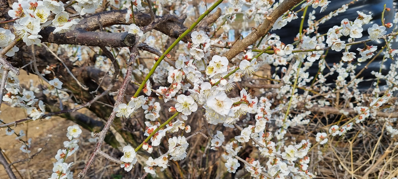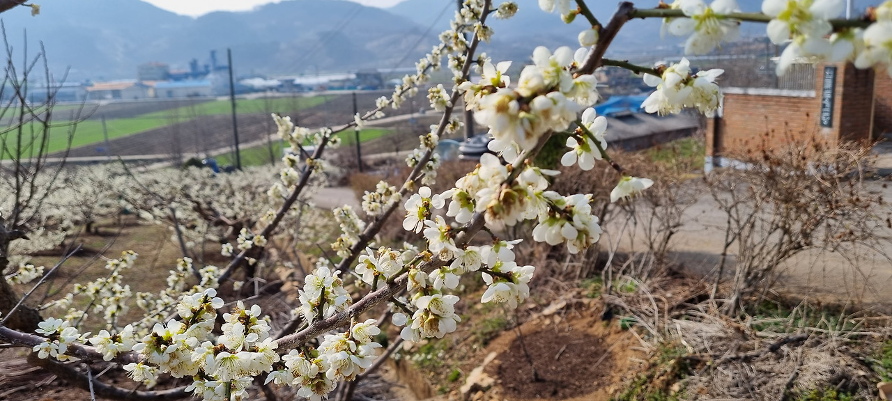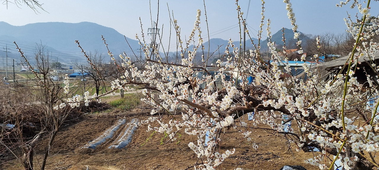 시골 마을이라 주차할 곳이 보이지 않는다. 마을을 두어 바퀴 돌다가 어쩔 수 없이 길 가에 가급적 교통이 방해가 되지 않도록 적당히 주차를 하였다. 언덕길을 걸어 올라가니 양쪽이 모두 매실농장이며, 매화가 활짝 피었다. 광양 매화마을의 경우 관광 목적을 겸한 매실농장이지만, 이곳은 관광수요보다는 작물로서의 매실 경작을 위한 농장인 것 같았다. 그래서 관광수요에 대한 배려는 그다지 없었다. 광양 매화마을의 경우 매실 농장은 물론 집집마다 매화나무를 심어 마을 전체가 매화꽃에 묻혀있다는 느낌이 드는데, 이곳은 민가와 농장이 분리되어 있는 느낌이다. 또 광양 매화마을의 경우 홍매화와 백매화가 섞여 절경을 이루지만, 이곳은 거의 백매화로만 이루어져 화려함이 덜하다.