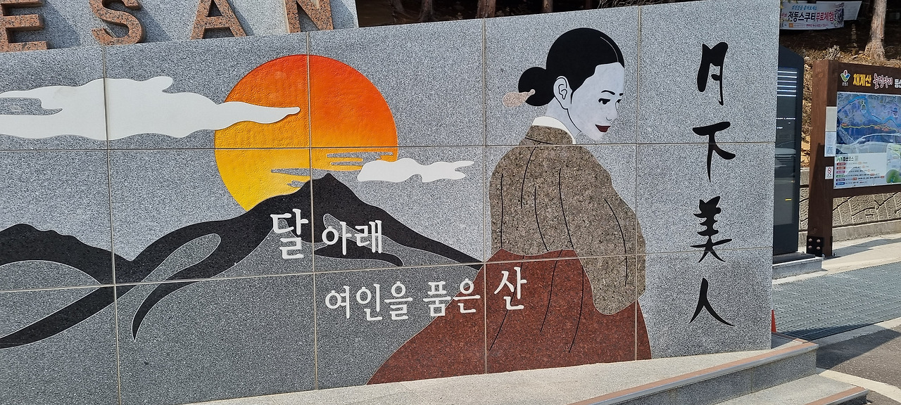 채계산 주차장은 여러 개가 있는데 제일 먼 출렁다리에서 제일 먼 주차장에 주차를 하였다. 꽤 걸어서 채계산 입구로 갔다. 출렁다리로 가는 산길 입구에는 출렁다리에 대한 설명과 큰 화강암 벽에 월하미인(月下美人)의 그림이 새겨져 있다. 채계산의 모습이 마치 비녀를 꽂은 여인이 누워서 달을 보며 창을 하는 모습을 하고 있기 때문이라는 설명이다. 채계산 저쪽으로 흐르고 있는 강은 적성강(赤城江)이라 하는데, 이는 섬진강 상류를 일컫는 말이다.