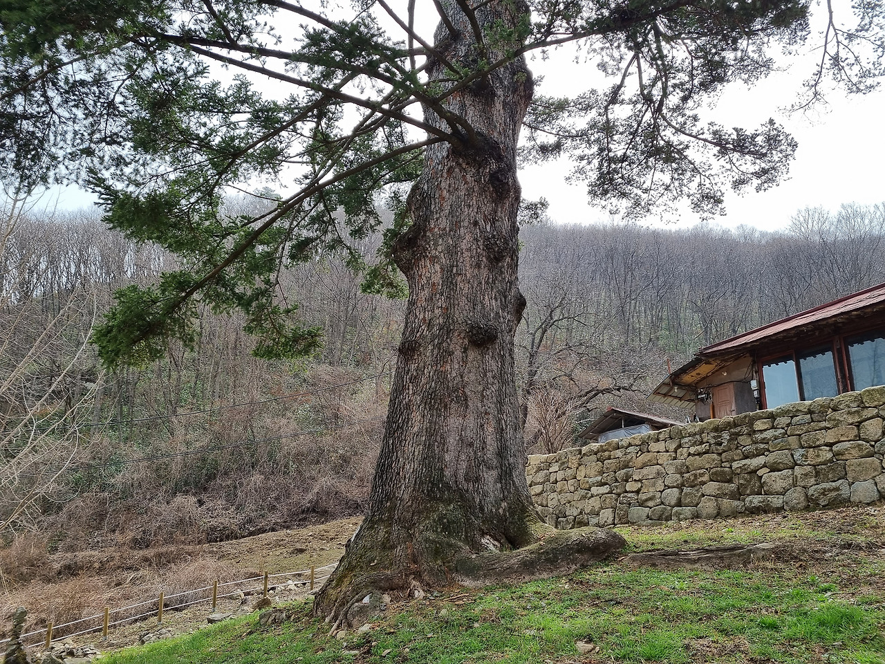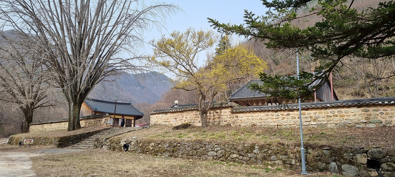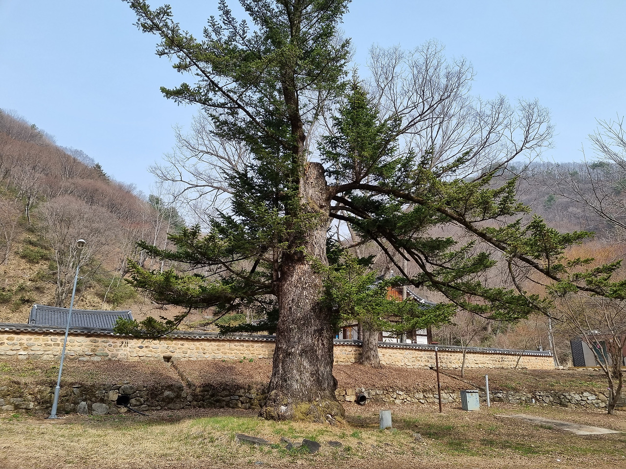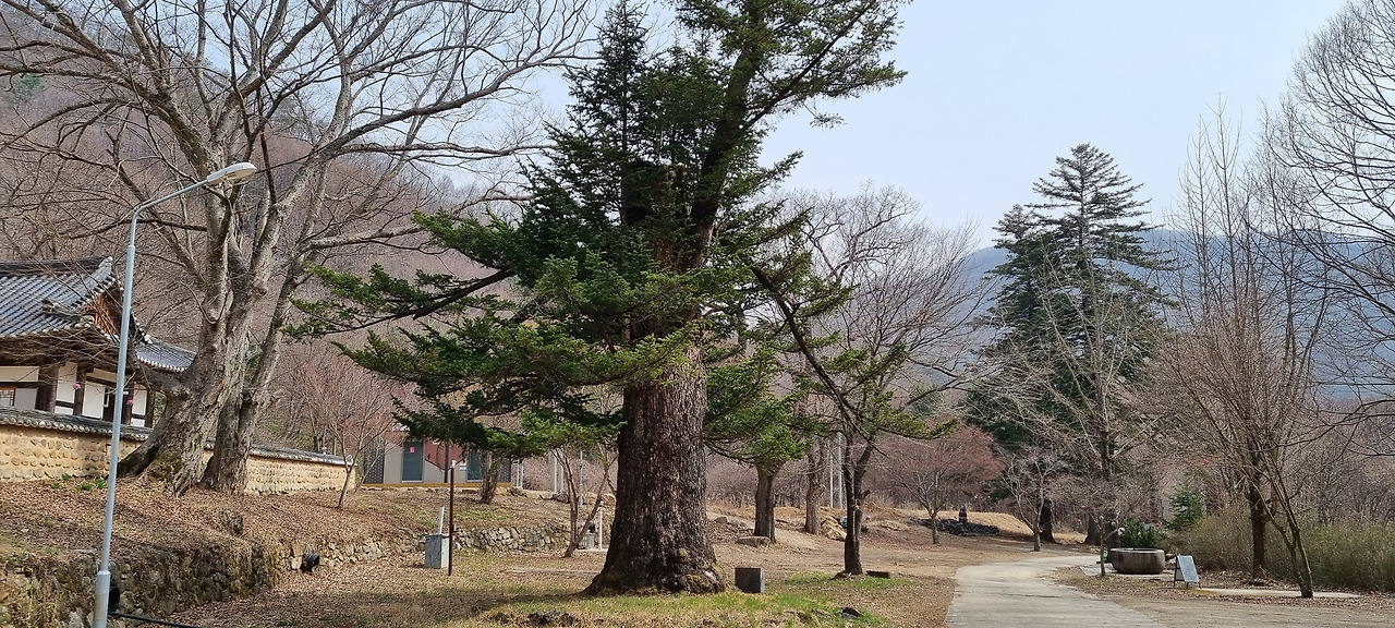 절을 둘러보고 나오면 문 옆으로 몇 그루의 큰 산수유나무가 있어 노란 꽃을 화려하게 피우고 있다. 그 옆으로 조금만 가면 윗 둥치가 잘려나간 전나무가 서있다. 이 전나무는 1184년에 심어졌다고 하니 나이가 거의 840살이 된다. 이 나무는 키가 35미터 정도로 컸으나 2002년 태풍 루사 때 윗 둥치가 잘려나가 지금의 모습으로 되었다고 한다. 지금도 높이가 20미터는 되는 것 같다. 이 나무는 밑둥치가 괴목처럼 변해있어 오랜 세월 동안 풍상을 견뎌온 나이를 말해준다. 이 나무는 보호수로 지정되어 있다.