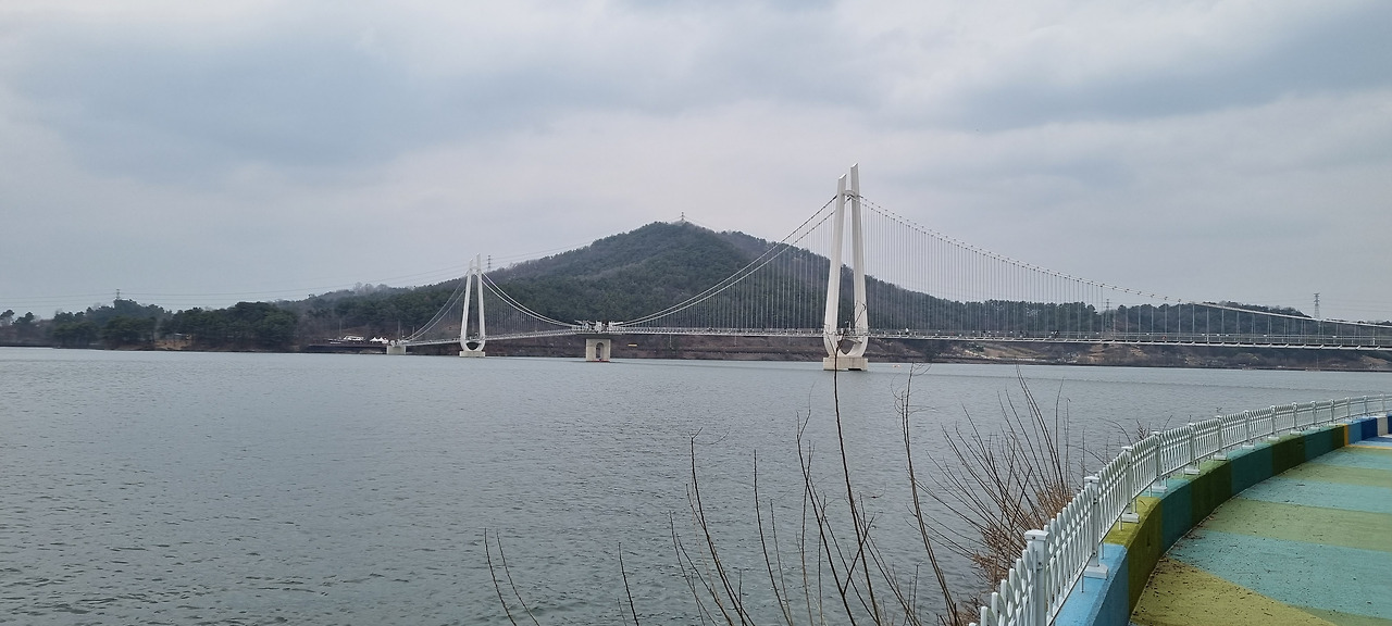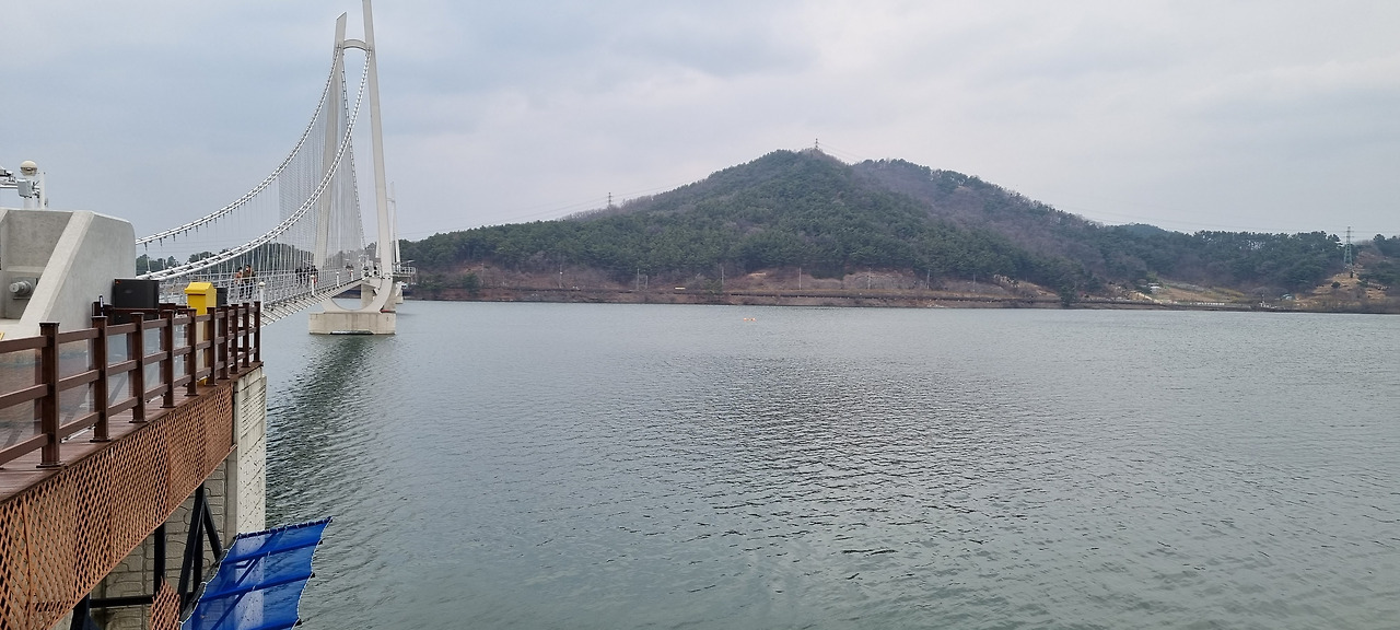 출렁다리는 호수 이쪽에서 저쪽으로 건너갈 수 있도록 만들어져 있다. 길이는 꼭 900미터이다. 이번 여행 첫날 들렀던 청양 천장호 출렁다리가 길이 250미터로 우리나라에서 제일 긴 출렁다리라고 소개되어 있었는데, 이 다리는 거기에 비해 무려 4배 가까이 길다. 또 이 다리는 가장 최근에 건설한 만큼 아름다움과 시설도 뛰어나다. 천장호에는 좀 미안한 말이지만 그곳과 이곳은 비교할 대상이 못된다.