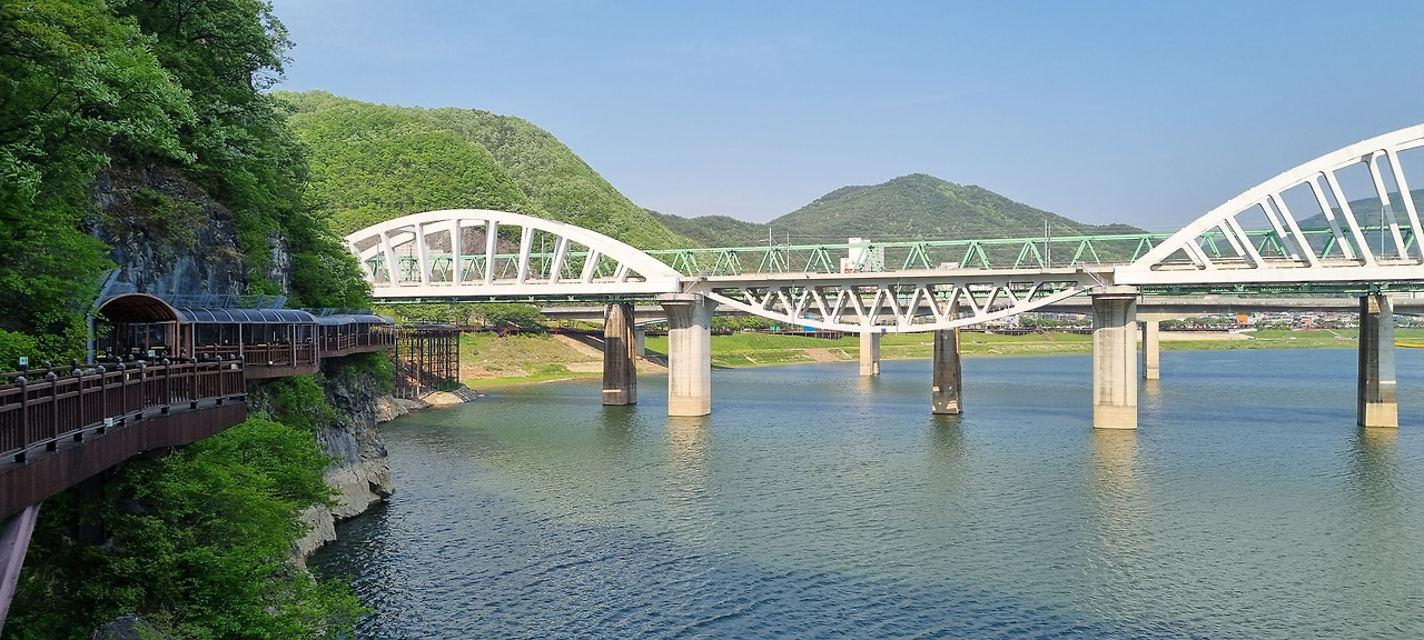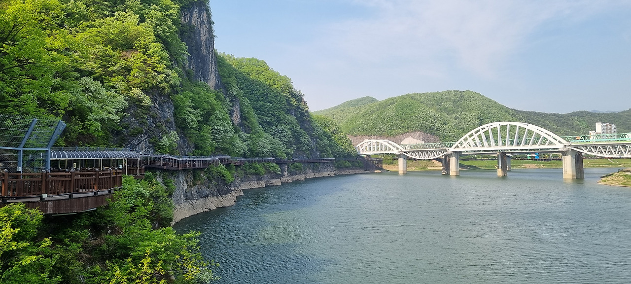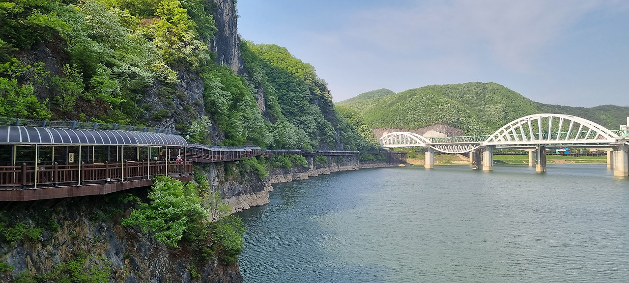 주차장에 차를 주차한 후 300미터 남짓 걸으면 단양강 잔도가 나온다. 얼마 안 되는 거리이지만 더위에다 몸은 지쳐 걷기가 무척 괴롭다. 괜히 왔나 하는 생각이 들기도 했다. 그런데 바로 앞에 강 위로 걸쳐진 다리 밑으로 잔도가 시작되자 그런 생각이 일시에 사라졌다.