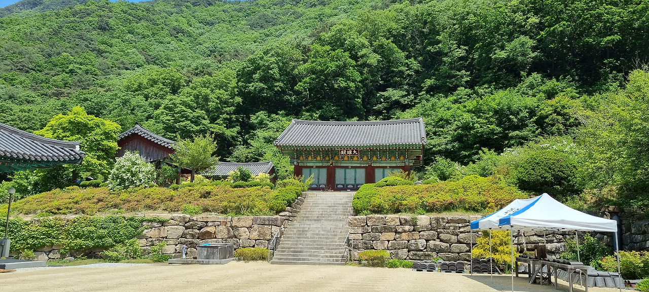 대웅전 뒤편에 있는 약간 넓은 잎의 나무가 보인다. 흔히 보이지 않는 나무인데 잎 색깔이 노란색과 연두색의 중간쯤으로 보인다. 얼른 찾아보니 프락시누스 크리피티라는 이름의 나무란다. 나무 이름이 너무 어려워 외우는 걸 포기하였다. 대웅전에서 절 마당으로 내려가는 돌계단 옆에는 꽃잔디가 화려하게 피어있다.