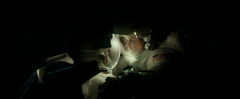 망원경을 수리하던 라이언 스톤 박사(산드라 블록)는 우주선 잔해로 인해 우주로 튕겨나가게 된다. 그러나 코왈스키는 스톤을 찾아 다시 우주왕복선으로 돌아간다. 그렇지만 이미 우주왕복선은 막대한 피해를 입어 더 이상 운행이 불가능하다. 스톤 박사와 코왈스키를 제외한 다른 승무원은 모두 사망해버렸다. 절체절명의 위기에 놓인 이들은 곧 이 우주왕복선에서 900마일 떨어진 곳에 러시아의 우주정거장이 있다는 것을 알고, 그것을 이용하여 지구로 귀환하려 한다. 두 사람은 우주공간을 유영하여 러시아의 우주정거장으로 간다.