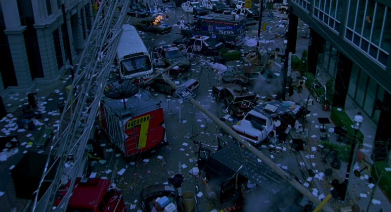 이제 앨리스와 좀비들 간에 치열한 싸움이 전개된다. 좀비들은 그들의 가장 강력한 무기인 숫자를 앞세워 인간들을 공격한다. 좀비에 맞서 싸우는 인간들은 강력한 총기를 총동원하지만 좀비들의 인해전술은 감당할 수 없다. 방어 대원들은 차례차례 좀비에 물려 좀비로 변해간다. 이러한 가운데 주인공 앨리스는 그야말로 초인적인 전사이다. 좀비들이 아무리 몰려와도 그녀에게는 손끝 하나 댈 수 없다. 앨리스는 공격해오는 좀비들을 물리치지만, 그렇다고 끝도 없이 달려드는 좀비 모두를 그녀 혼자서 해치울 수는 없다.