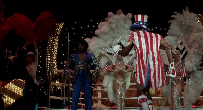 시합은 라스베이거스에서 개최된다. 호텔 특설링에서 열리는 시합에서 아폴로는 흥행가로서의 그의 수완을 적극 발휘하여 화려한 개막 이벤트를 개최한다. 댄서들의 화려한 춤과 음악 속에서 아폴로가 등장한다. 드리고는 복싱 시합장이 아니라 마치 거대한 쇼 극장과 같은 경기장의 모습과 댄서들의 춤과 음악에 어리둥절한 표정이다. “자유국가 미국”과 “전체주의 독재국가 소련”의 대비를 암시하는 장면이다. 요란한 춤과 음악 속에서 마치 무하마드 알리처럼 떠벌리며 등장한 아폴로지만 막상 시합이 시작되자 드리고의 상대가 되지 못한다. 일방적으로 불리한 상황에서 치열한 투혼을 발휘하지만 아폴로는 비참하게 KO 당하고 사망한다.