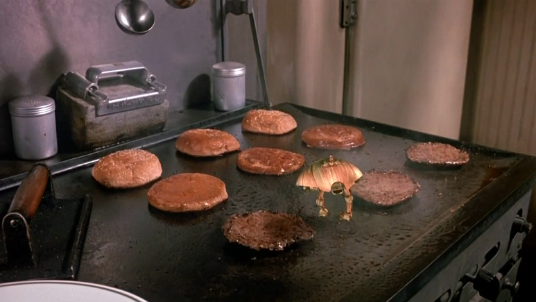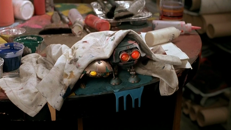 철거 건물 1층에서 허름한 레스토랑을 운영하는 프랭크와 그의 아내 페이, 무명 화가 메이슨, 애인에게 버림받은 마리스, 은퇴한 흑인 복서 해리 등은 매일매일 깡패들에게 협박당하면서도 이주를 거부한다. 어느 날 페이는 이상한 소리를 듣고 잠을 깼다. 일어나 보니 조그만 비행접시 같은 물체가 집안을 날아다니고 있었다. 비행접시는 온 집안을 날아다니며 낮에 깡패들이 부숴버린 집기들을 고치고 있었다. 그 대신 집에 있는 전기와 금속을 먹는다. 조그만 비행접시는 하나가 아니라 둘이다. 그 두 개의 비행접시는 부부로서, 남편 비행접시는 푸른 눈을, 아내 비행접시는 붉은 눈을 가지고 있다.