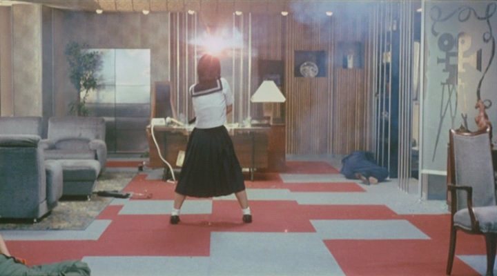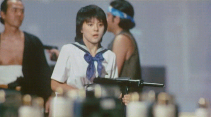 영화 제목 <세라복과 기관총>을 보면 마치 주인공인 여고생이 마치 레지던트 이블의 앨리스처럼 굉장한 여전사로 느껴진다. 그러나 전혀 그렇지 않다. 그저 밝고 명랑하며, 여고생 치고는 약간 배짱이 좋은 평범한 학생이다. 그런 이즈미가 어설프지만 순진하고 충성심 깊은 부하들과 자신의 진심을 힘으로 강대한 야쿠자 조직과 싸워나간다. 기관총을 들고 상대 조직 본부에 뛰어들지만 총을 든 모습이 어설프기 짝이 없다. 기관총의 반동으로 총알은 제멋대로 날아간다.