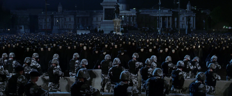 권력 심층부의 균열과 브이의 활약에 차츰 의식의 변화가 생긴다. 마침내 시민들도 움직이기 시작한다. 거대한 피플 파워의 행렬이 노도와 같이 이어진다. 마치 우리나라의 촛불 혁명을 연상시킨다. 중상을 입은 브이는 이디가 있는 곳으로 돌아와 숨을 거둔다. 이디는 브이의 가면을 벗기고 그의 정체를 확인하고 싶었지만, 포기한다. 대신 브이의 가면과 복장을 대신 착용하고 시민들의 선봉에 선다. 마침내 노도와 같은 피플 파워는 독재정권을 타도에 나서고, 피플 파워는 승리한다.