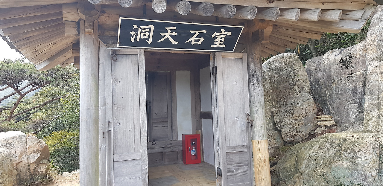 윤선도 원림을 나와 조금 더 가면 저쪽 가파른 바위산 중턱에 두 개의 정자 비슷한 건물이 보인다. 바로 동천석실(洞天石室)이다. 고산은 이곳에서 독서와 사색을 즐겼다고 한다. 매우 가파르게 보여 갈까 말까 잠시 망설였는데, 올라가기로 했다. 길이 생각한 이상으로 험하다. 괜히 올라왔다고 후회가 된다. 작년 베트남 사파에서 험한 길을 가다가 사고를 당한 후 가능한 한 험한 길은 가지 않으려고 했는데, 또 오르고 말았다. 일단 오르기 시작했으니 끝까지 올라갔다.