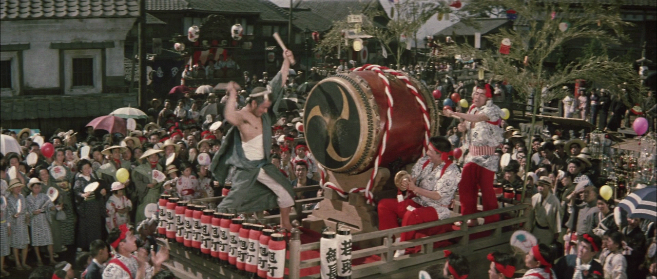 토시오의 선생은 본바닥의 “기온 큰 북”(祇園太鼓) 소리를 듣고 싶었다. 마츠고로는 토시오와 그의 선생을 큰 북 쪽으로 안내하였지만, 북을 제대로 칠 줄 아는 사람은 없다. 마츠고로는 다른 사람을 제치고 스스로 큰 북이 있는 곳으로 올라가 거칠고 화려한 북 솜씨를 보인다. 마을 구석구석으로 마츠고로의 북소리가 퍼져나간다.