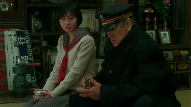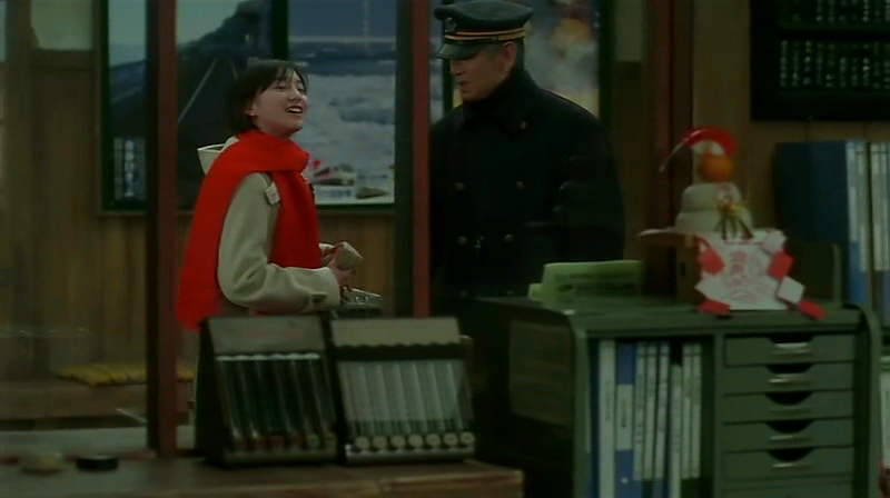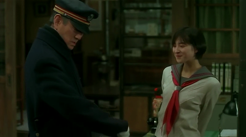 조금 있다고 고등학생 정도 되어 보이는 소녀가 찾아온다. 자기 동생이 역으로 간다고 하곤 돌아오지 않는데, 보지 못했느냐고 묻는다. 오토마츠는 지금까지 자기와 같이 있다가 조금 전에 돌아갔다고 말해준다. 소녀는 자신은 근처에 있는 절의 주지 스님의 손녀인데 할아버지를 뵈러 왔다고 하며, 역사 안을 둘러본다. 역사 안에 있는 물건들이 재미있는 모양이다. 오토마츠가 모아둔 열차 번호판이라든가 깃발 등을 둘러보면서 즐겁게 재잘거린다. 그런 소녀를 어디선가 본 듯한 느낌이다. 소녀는 오토마츠에게 찌개도 만들어준다. 너무나 감격한 오토마츠는 이젠 죽어도 좋겠다고 중얼거린다.