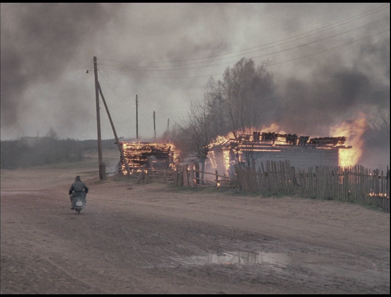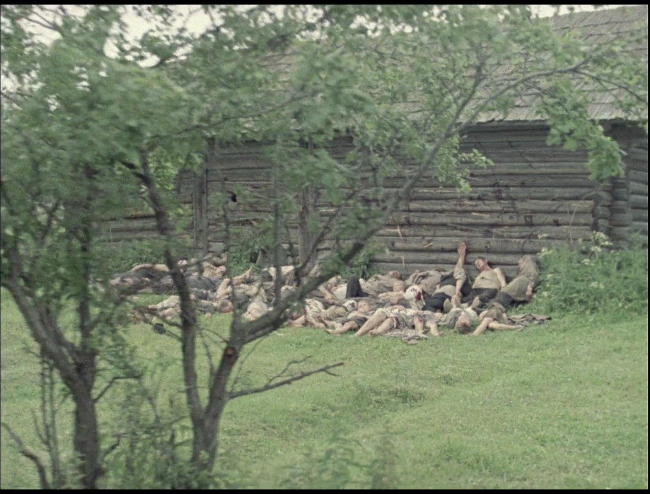 프료라와 몇 명의 마을 사람들이 창문을 통해 교회 밖으로 나오는 것을 보고는 독일군들은 즐겁게 웃으면서 교회를 향해 일제 사격을 행하고, 화염병과 화염방사기로 교회 건물에 불을 지른다. 불길이 타오르면서 비명소리는 점점 사그라져 간다. 독일군 병사들은 아이를 교회 안에 두고 나온 젊은이에게 아이를 구하고 싶으면 불타는 교회 안으로 들어가라고 놀린다. 독일군들은 불타는 교회를 배경으로 기념사진을 찍으며 프료라를 놀린다. 그리고 마을의 가축과 여성들을 약탈한 후, 독일군은 집집마다 불을 지른 후 방심 상태에 있는 생존자들을 남겨두고 사라진다.