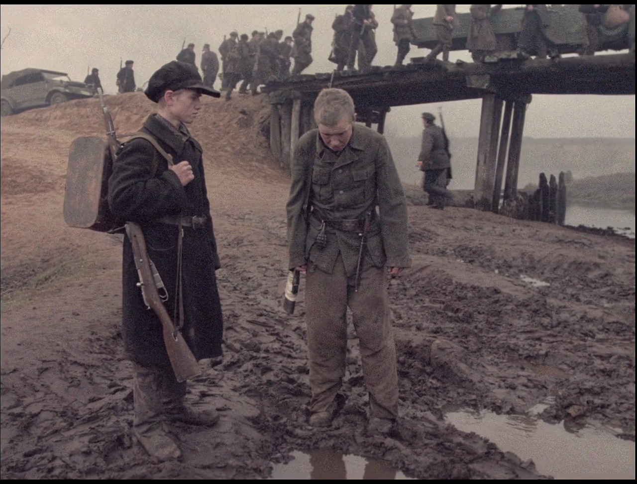 1943년 독일군에 점령당한 벨라루스에서 프료라 소년은 파르티잔이 숨긴 소총을 파내고 있었다. 그만두라는 마을 사람들의 말에 귀를 기울이지 않은 프료라 소년을 하늘에서 독일군 비행기가 감시를 하고 있었다. 다음날 아침 파르티잔 부대원의 한 무리가 이 마을로 들어왔다. 엄마의 말에도 귀를 기울이지 않고, 프료라는 어제 파낸 소총을 들고 파르티잔에 지원한다.