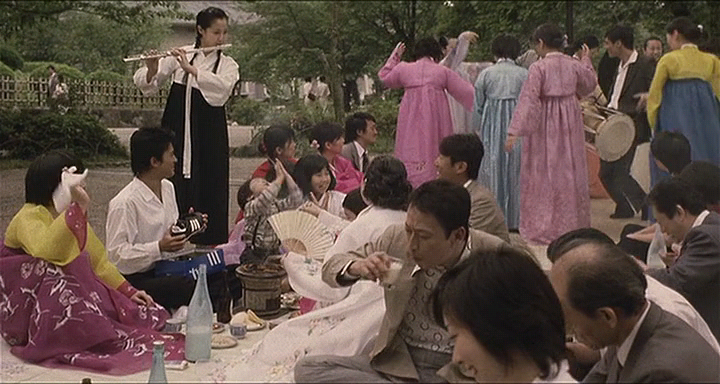 경자의 친척들과 이웃이 공원에서 야유회를 갖는다. 이들은 불고기를 구워 먹으며 즐거운 한 때를 보낸다. 이번 행사는 안성의 환송회를 겸한 자리이다. 조선인 학교의 축구 선수인 안성은 “조국을 대표하여 축구시합에 출전하기 위해” 북송선을 타고 북한으로 가려한다. 그런 그의 앞날을 축하하고 격려하는 의미에서 이 자리를 가진 것이다. 코스케는 자신을 초대한 사람도 없지만 이 행사에 참석한다. 그리고 경자와 함께 사람들 앞에서 <임진강>을 연주한다. 그의 연주를 듣고는 경자의 친지들도 코스케에 대해 마음을 연다.