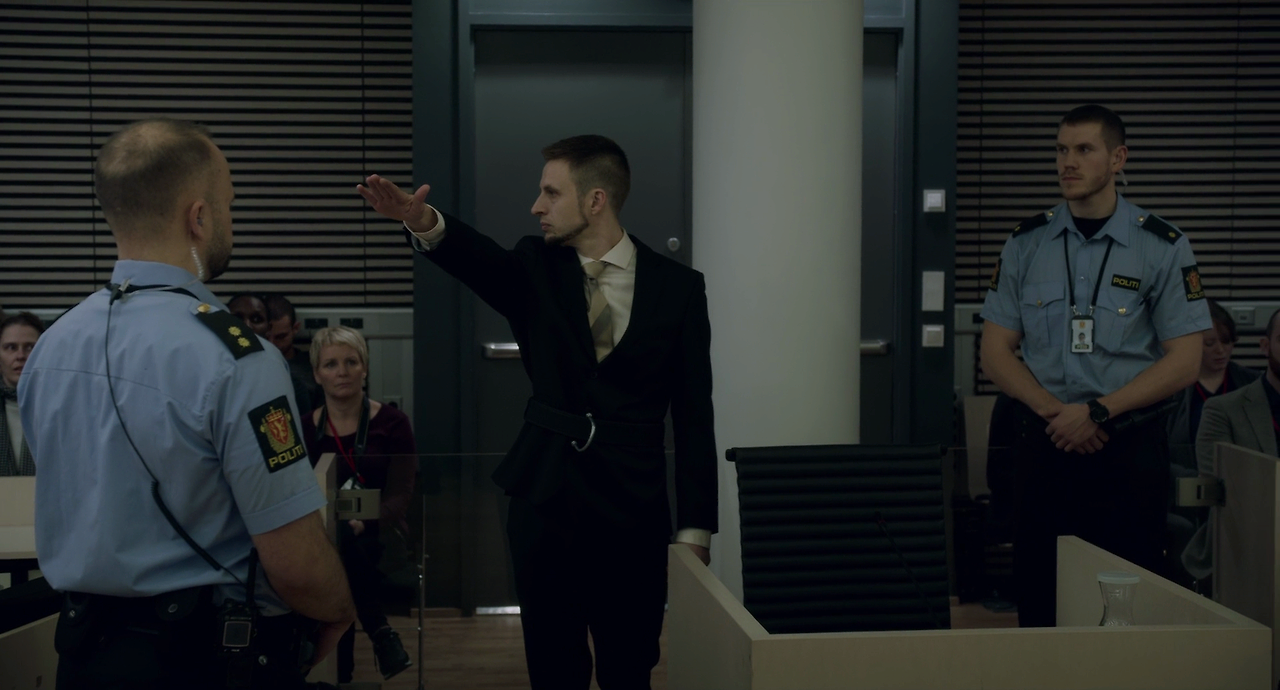 경찰에 체포된 브레이비크는 이민을 받아들이는 것을 중지하라는 등 극우적인 발언을 늘어놓으며 자신은 정당한 일을 하였다고 주장한다. 그리고는 릿베스터드를 자신의 국선 변호사로 지명한다. 연락을 받은 릿베스터드는 악랄한 테러범을 변호한다는데 부담을 느끼지만, 어떤 사람도 변호를 받을 권리가 있다는 원칙을 상기하고는 그 제안을 수용한다. 그리고 그때부터 릿베스터드는 브레이비크의 심문에 참관하며, 재판에서는 그를 변호한다. 그렇지만 릿베스터드 집으로는 협박 전화가 걸려오기도 한다.