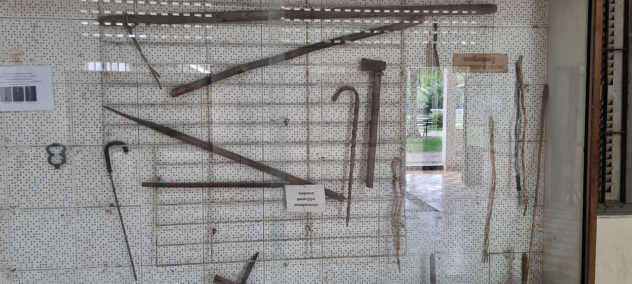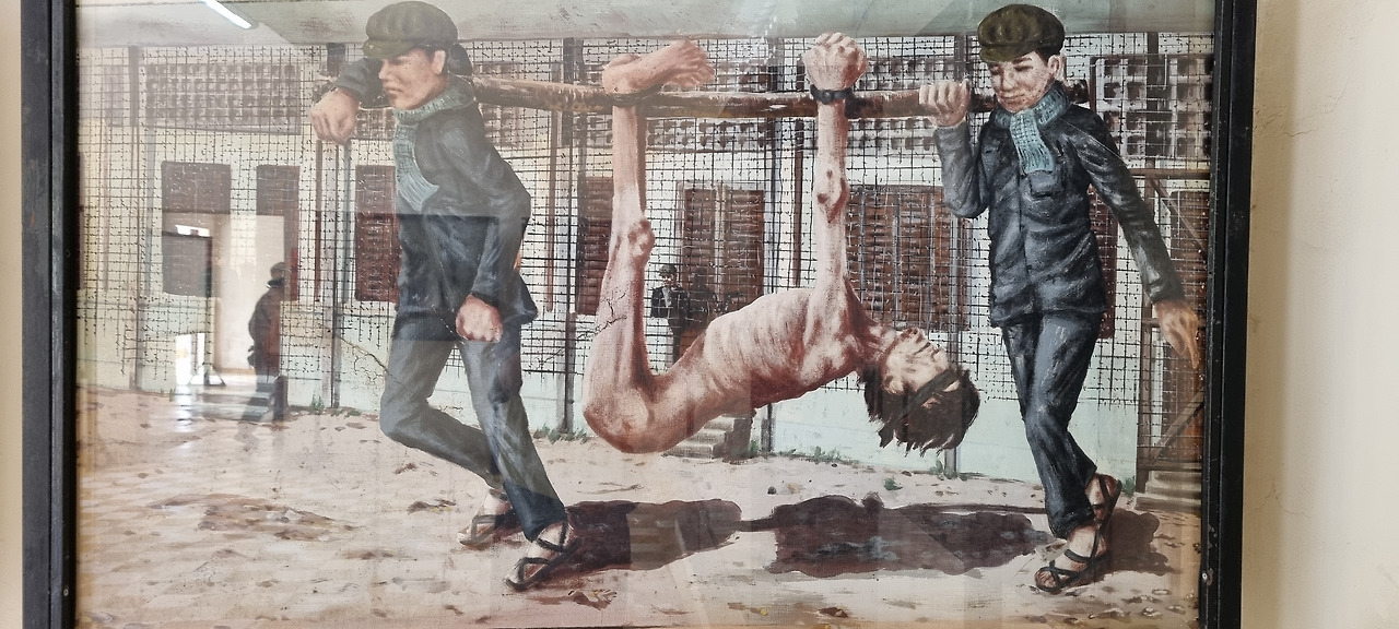 박물관은 'ㅁ' 자 형태로 되어있고 가운데는 운동장이다. 알고 보니 원래는 이곳이 학교였다고 한다. 그러고 보니 어린 시절 다녔던 초등학교와 비슷한 모습을 하고 있다. 건물 가까운 곳에는 그네 틀도 있고 철봉대도 있다. 아이들의 놀이 도구인 이것들이 모두 참혹한 고문대로 악용되었다. 그리고 교실은 감방과 고문실 등으로 사용되었다. 전시관에는 킬링필드의 폴 포트를 비롯한 책임자들의 사진과 함께 이곳에서 죽어간 수없이 많은 사람들의 사진들이 전시되어 있다. 그리고 고문에 사용된 끔찍한 도구들, 그리고 이를 묘사한 그림들도 전시되어 있다.