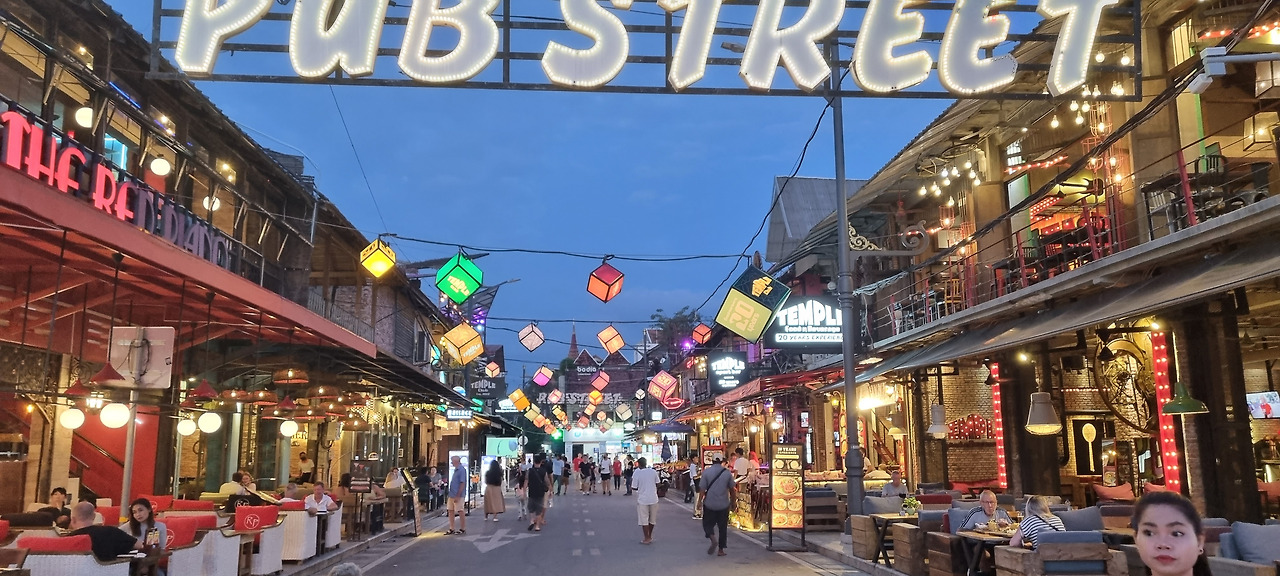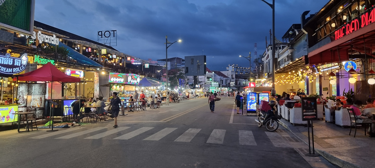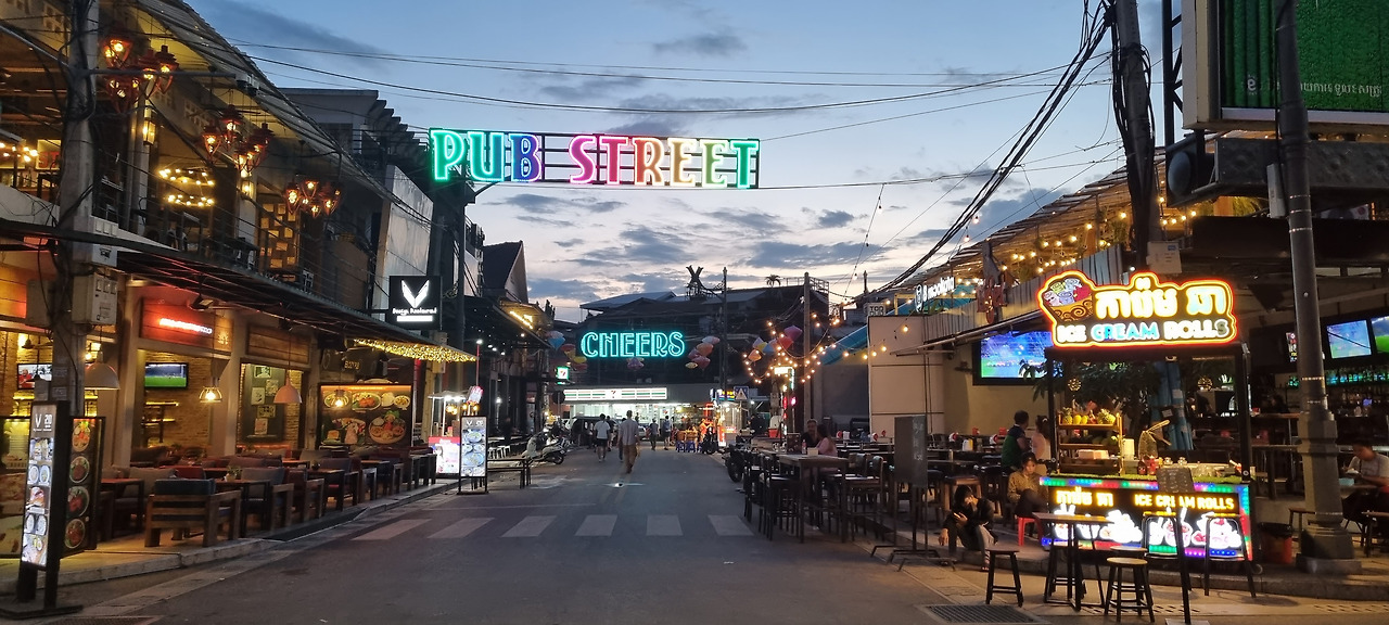 이곳 씨엠립에서 최고 번화한 거리는 퍼브 스트리트(Pub Street)이다. 이곳에는 바를 비롯한 각종 술집들이 몰려있어 여행자들은 대개 이곳을 찾는다. 그러나 씨엠립에서 음식점은 여기뿐만 아니다. 씨엠립은 전적으로 앙코르와트 관광을 위해 만들어진 도시이다. 그래서 마을 전체가 관광객을 상대로 한 업소들로 이루어져 있다. 음식점, 술집, 여행사, 마사지 샵이 한집 건너 한집이다.