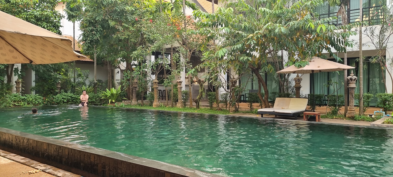 예약한 호텔은 중심가에서 2킬로 정도 떨어진 곳에 위치하고 있다. 토네이 앙코르 리조트(Tonei Angkor Resort and Spa)란 호텔인데 1박당 25불로 가성비가 좋은 꽤 괜찮은 곳이다. 호텔 가운데 직사각형의 제법 큰 풀이 있고 그 주위를 리조트 풍의 객실이 4면을 둘러싸고 있다. 방에서 수영복만 입고 나와 바로 풀에 들어가면 된다. 다운타운에서 떨어져 있어 그런지 손님이 거의 없다. 객실이 40개 정도 되어 보이는데, 어떤 날은 투숙객이 우리밖에 없을 때도 있었다. 투수객이 많은 날이라 해봐야 4-5실 정도. 매출액이 100불에 불과하다. 이곳도 코로나로 심대한 타격을 입은 것 같다.