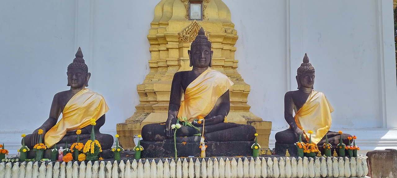 그런데 들어가 보니 아주 작다. 건물도 서너 개 정도밖에 없는 것 같다. 그렇지만 큰 사찰은 아니지만, 다른 동남아의 사찰들과 마찬가지로 아주 화려하다. 경내에 있는 크고 작은 탑들을 비롯한 건축물들이 황금색으로 번쩍인다. 오늘은 무슨 큰 행사가 있는 듯하다. 많은 사람들로 붐비고 있으며, 연회도 벌어지는 듯하다. 야외에는 천막을 쳐놓고 그 안에 식탁과 의자들을 비치해두고 있다. 결혼식 같기도 한데, 어떤 행사인지는 잘 모르겠다. 야외에 짙은 회색의 불상 3개가 나란히 앉아있다.