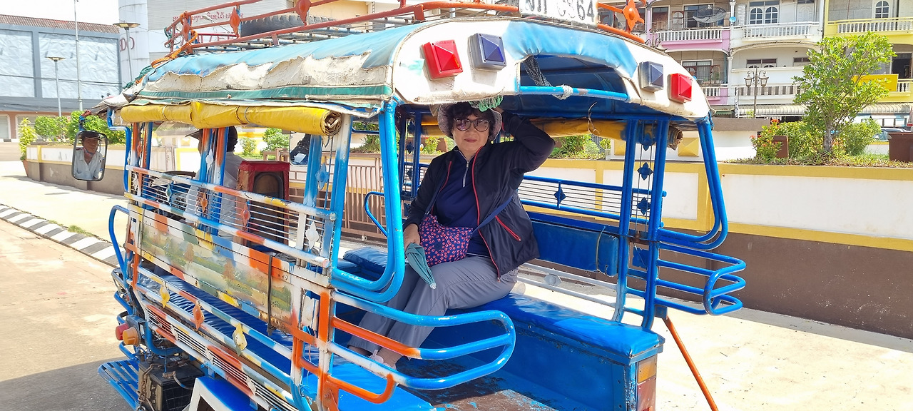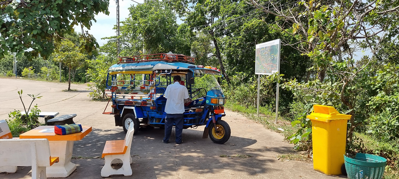 이제 버스 출발시간까지 어디선가 시간을 보내야 한다. 왓루앙 사원과 황금 부처상 2곳을 가기로 했다. 호텔에 부탁해 툭툭이를 불렀다. 그런데 라오스 툭툭이는 캄보디아와 같은 인력거 스타일이 아니라 태국의 쏭태우와 같은 모습을 하고 있다. 즉 오토바이 뒤에 케이지를 달아놓은 것이 아니라 양쪽으로 자리가 있는 작은 트럭의 짐칸 같은 것을 달아놓았다. 그래서 타고 가면 좌석이 불편하기 짝이 없다.