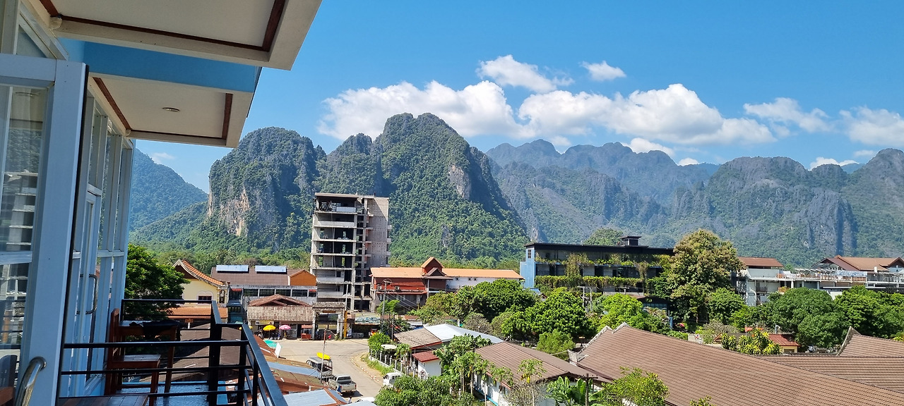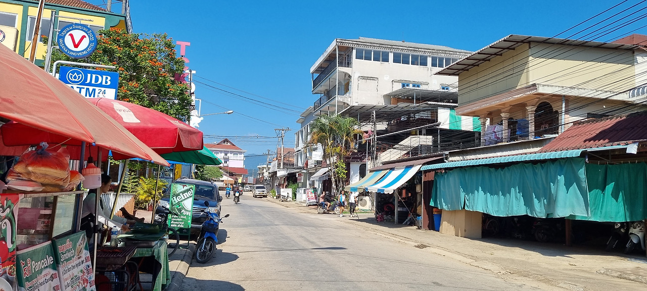 아침에 픽업을 온 툭툭이를 타고 방비엥행 밴이 출발하는 곳으로 갔다. 대여섯 대의 밴이 대기하고 았었는데, 여러 곳에서 모인 여행객들이 각자에게 지정된 밴에 탑승하자 차들은 곧 출발였다. 시내를 빠져나오자 바로 고속도로다. 고속도로는 한산하다. 우리가 탄 밴은 시속 90킬로 정도로 달리는데, 그동안 시골길로 덜컹거리며 달리는 차들만 탄 때문인지 엄청 빠른 느낌이다. 한 시간 조금 넘는 시간을 달려 방비엥에 도착했다.