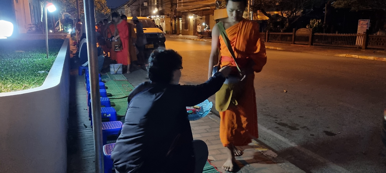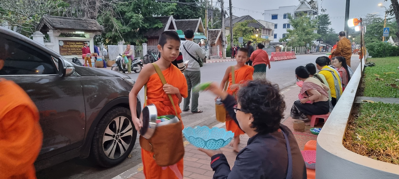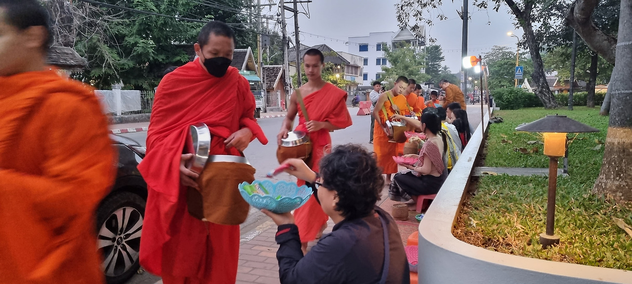 탁발 장소에 가니 우리가 제일 먼저 도착하였다. 탁발할 과자 바구니를 파는 아주머니들이 여럿 나와있다. 한 바구니의 과자를 2만 낍에 팔고 있다. 날이 밝아지면서 탁발 행사에 참여하려는 사람들이 점점 늘고 있다. 사람들이 길가에 자리를 잡자 저 멀리서 주황색 승복을 입은 스님들의 행렬이 나타난다. 머리가 하얗게 쉰 노스님도 있고, 열 살도 안되어 보이는 동자승도 있다. 스님들이 앞을 지나가면 신도들은 밥이든 과자든 돈이든 준비한 것들을 탁발 그릇에 넣는다.