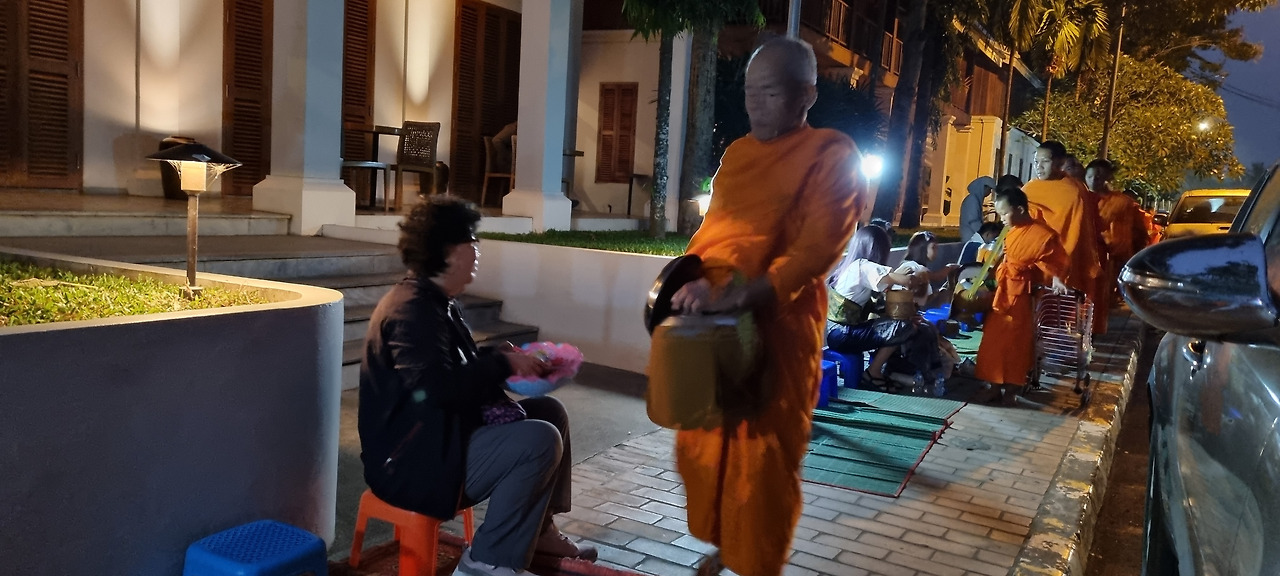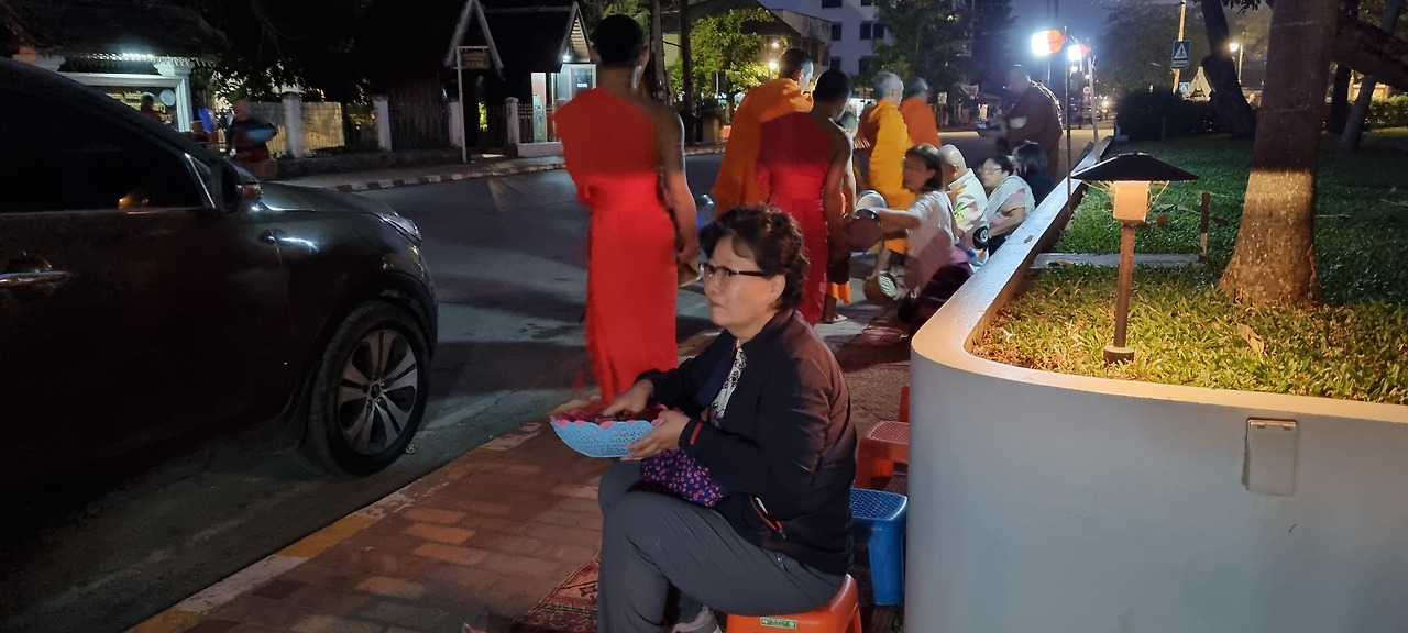 루앙프라방의 탁발의식은 유명하다. 열을 지어 길거리에 앉아있는 신도들 앞으로 스님들이 일열로 지나가면서 탁발을 하는 의식이다. 집사람이 여기에 참여하고 싶다고 한다. 호텔에 문의하니 탁발 의식은 아침 5시 반에 시작한다고 한다.