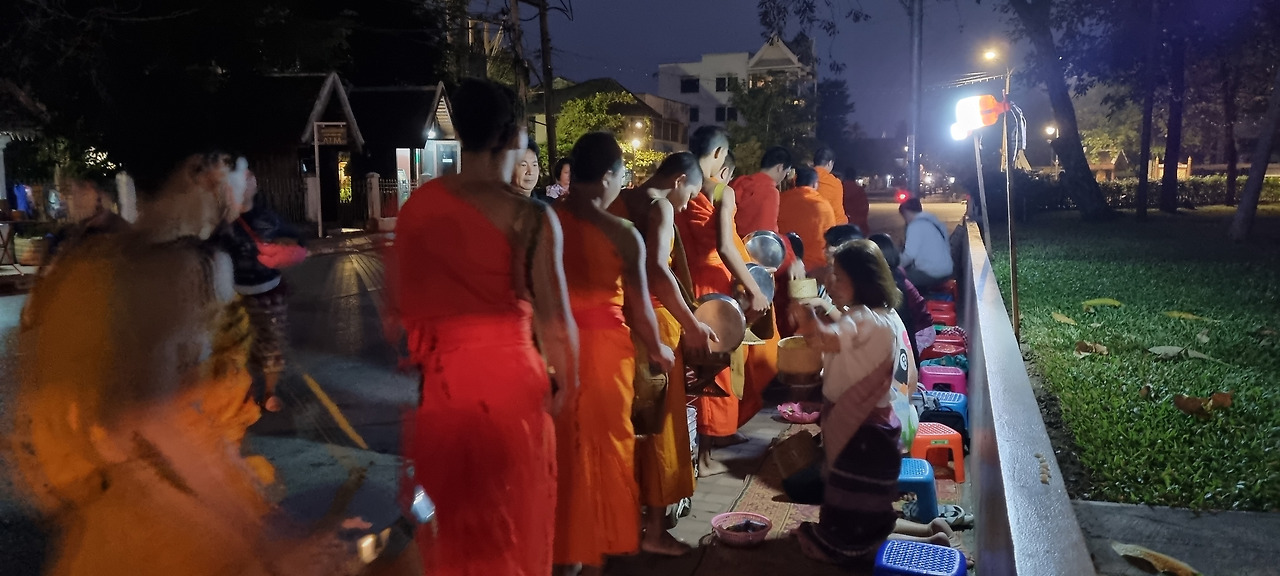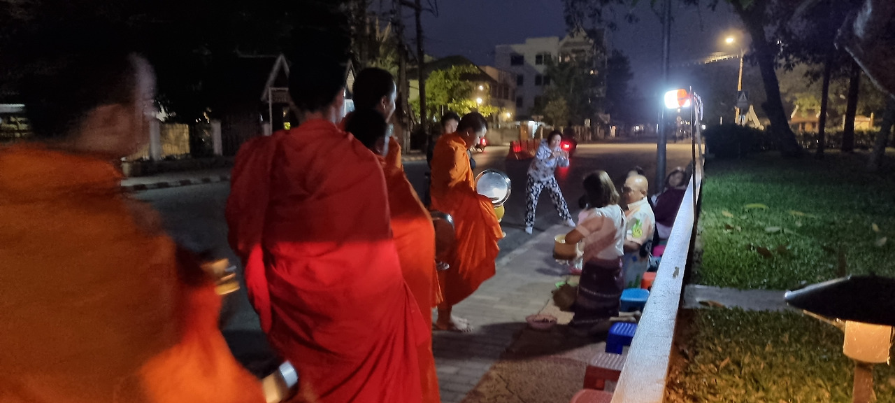 스님들의 행렬이 한차례 지나가고 나니 이제 탁발 의식이 끝났나 하는 생각이 들었다. 이제 날도 밝았다. 그런데도 사람들은 일어날 생각을 않는다. 지나갔던 스님들이 다시 되돌아오면서 탁발 의식은 계속된다. 이렇게 많은 스님들이 줄지어 오니 준비한 돈은 금방 바닥이 난다. 어쩔 수 없이 급히 과자 바구니를 몇 개 샀다. 그래도 부족할 듯하다. 다시 급히 잔돈을 바꾸었다. 그리고 그것마저 바닥이 날 때쯤 탁발행사가 끝이 났다.