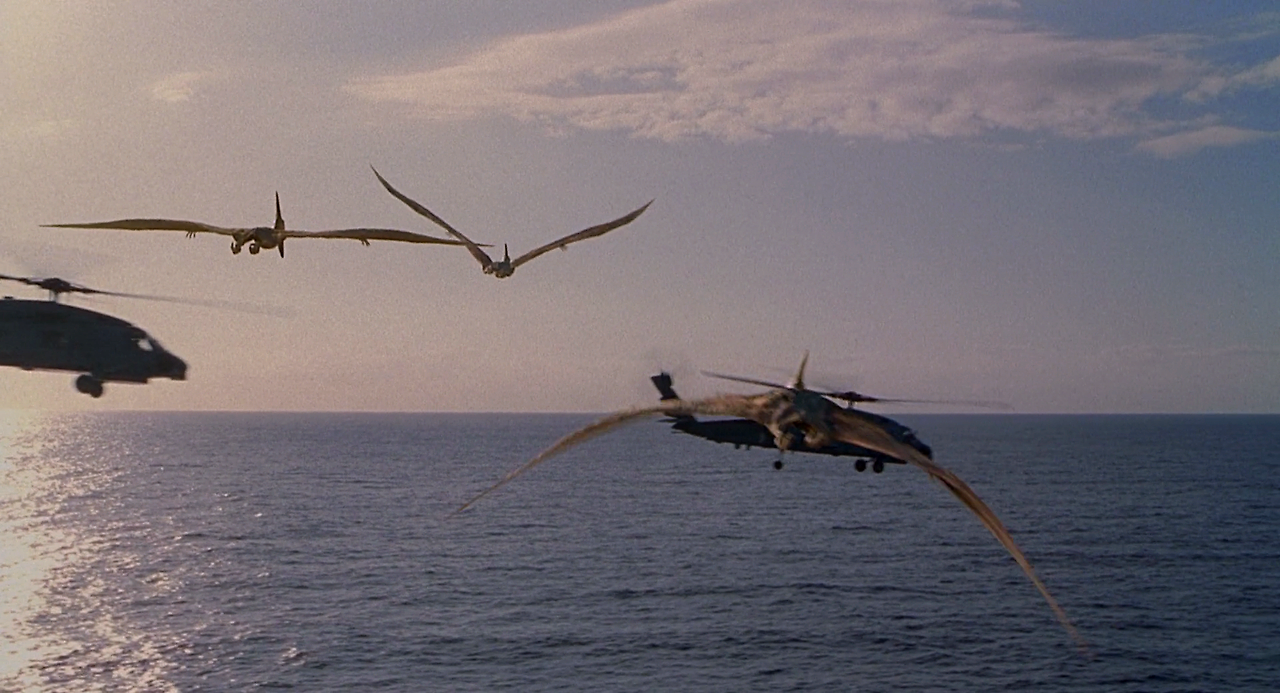 그런데 그곳에서 그들 일행을 기다리는 위험이 있었으니 바로 벨롭키랩토 무리였다. 일촉즉발의 위험 속에서 알란은 가지고 있던 가방에서 알을 꺼내 벨롭키랩토 앞에 놓으면서 싸울 의지가 없다는 자세를 보인다. 벨롭키렙토 무리는 더 이상의 위협을 멈추고 알을 물고 돌아간다. 드디어 그들 앞에는 그들을 구조 해갈 헬리콥터가 나타났다. 그리고 헬리콥터 안에는 이미 죽었다고 생각한 빌리가 부상을 입은 채 타고 있었다. 헬리콥터를 타고 돌아가는 그들 일행 곁으로 섬에서 빠져나온 프테라노돈의 떼가 새로운 세계를 찾아 날아가고 있다.