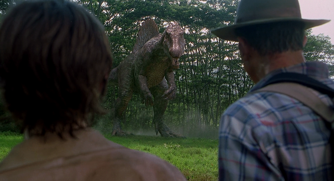 비행기 속에는 커비 부부와 함께 폴의 부하인 유데스키, 냇슈, 구퍼 세 사람도 동승하고 있었다. 섬의 상공에 다다르자, 그들은 알란의 말을 따르지 않고 섬에 착륙한다. 알란은 당초 이야기와 다르다고 무슨 짓이냐고 화를 내지만 이미 때는 늦었다. 섬에 착륙하여 아만다는 폴의 부하들과 함께 단독 행동에 나선다. 알란은 그들에게 빨리 비행기로 돌아오라고 하지만, 이니 때는 늦었다. T렉스보다 더 크고 더 위험한 육식 공룡 스피노사우르스가 비행기를 공격하여 파괴시켜 버리고 만다. 그리고 폴의 부하인 냇슈와 쿠퍼는 차례차례 공룡에게 희생당하고 만다.