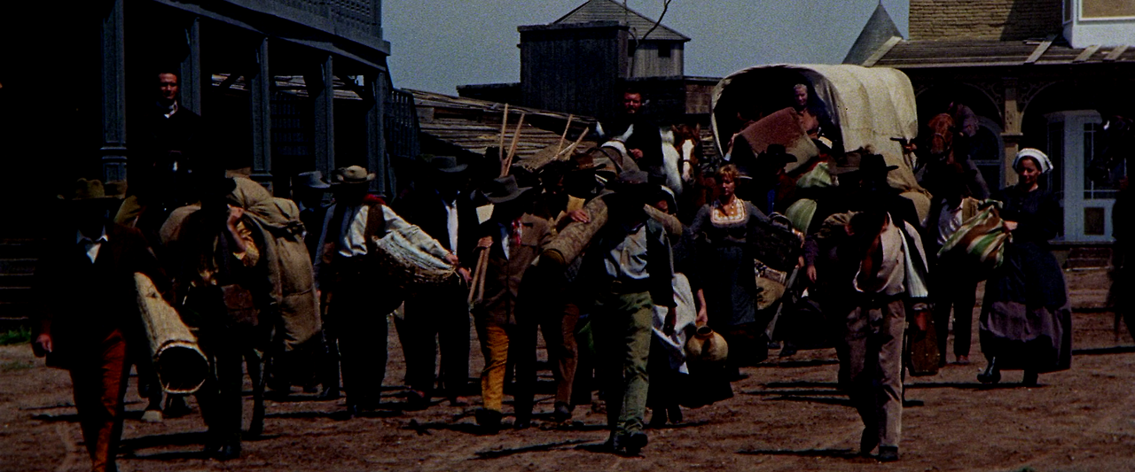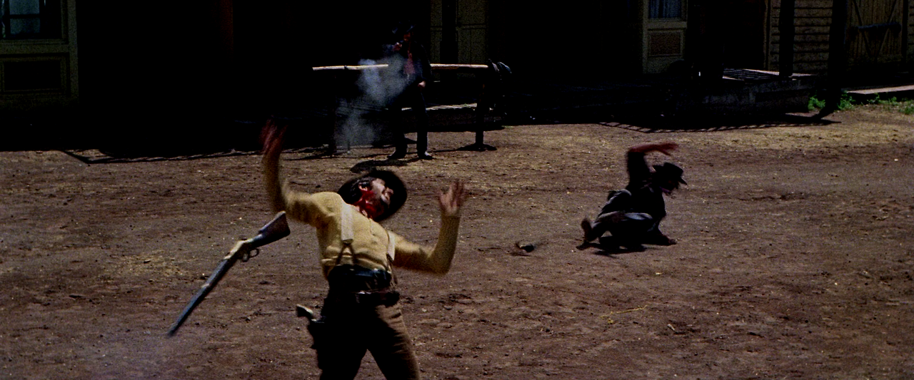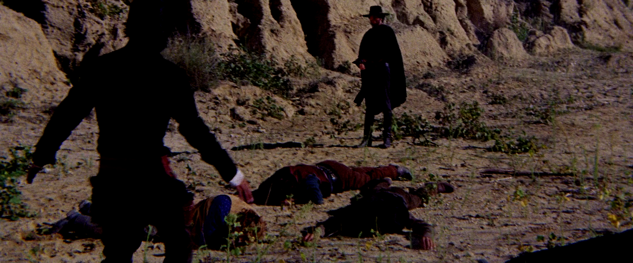 서부의 어느 조그만 시골마을, 먼지바람이 불어오는 속에서 검은 옷을 입은 한 사람의 건맨이 나타난다. 그는 누군가의 죽음을 의미하는지 거친 나무십자가의 묘비를 땅에 꽂는다. 그 묘비에는 샘 호킨스라는 이름이 새겨져 있다. 그리고는 총성이 메마른 마을에 울려 퍼진다. 순식간에 샘과 그 일당들이 쓰러진다.