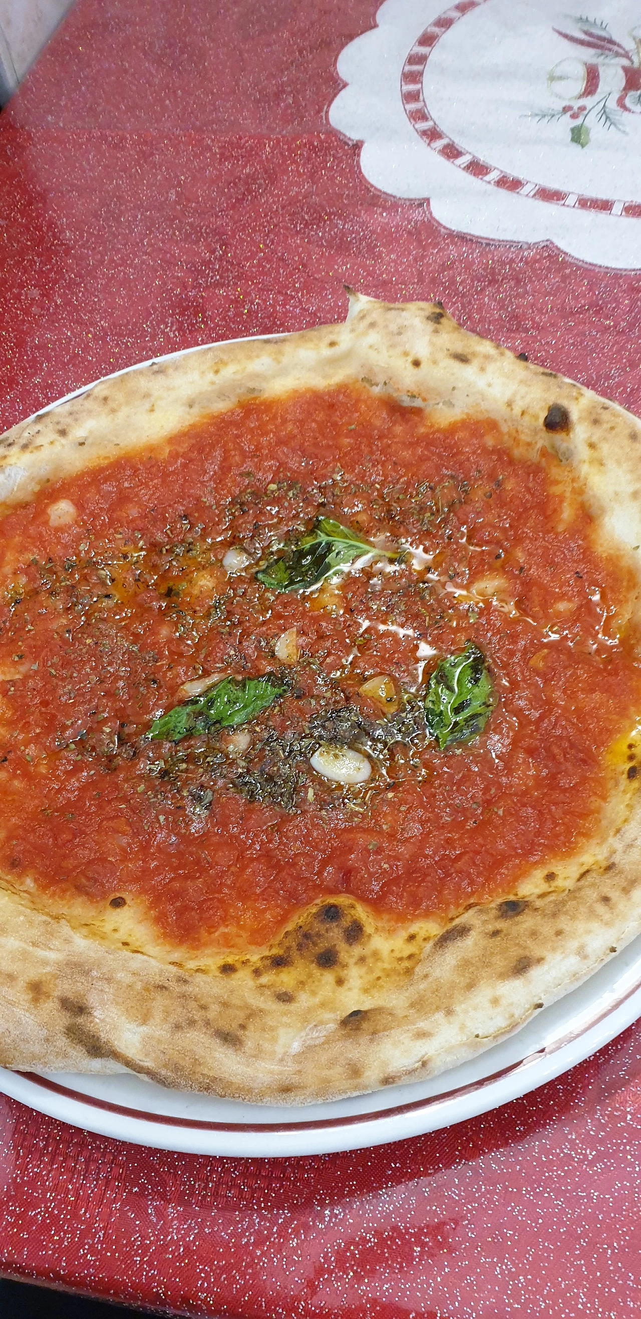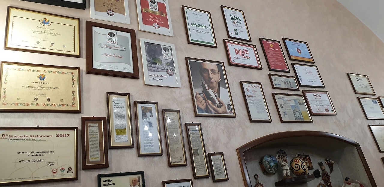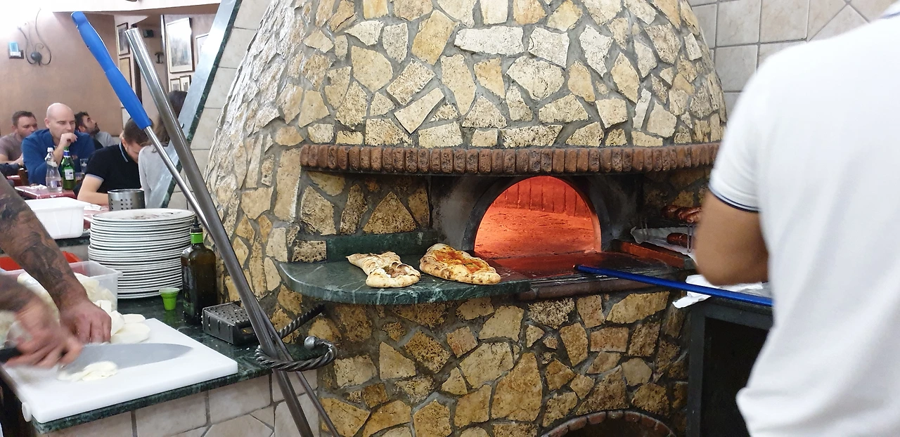 일찍 도착했음에도 가게는 손님으로 붐볐다. 마침 남은 자리는 동석을 해야 앉을 수 있는 딱 한 자리. 옆 사람과 인사를 나누고 피자를 함께 주문한다. 기다리는 동안 가게를 둘러보았다. 도우를 만드는 사람, 토핑을 올리는 사람, 화구에서 피자를 넣고 빼는 사람 등등 명확한 분업에서 전통과 경력이 느껴진다. 테이블과 인테리어는 허름했으나 벽에 붙은 읽지 못할 상장과 증명서들이 이들의 명성을 실감케 했다. 이보다 더 허름한 화구는 장인의 향을 풍긴다.